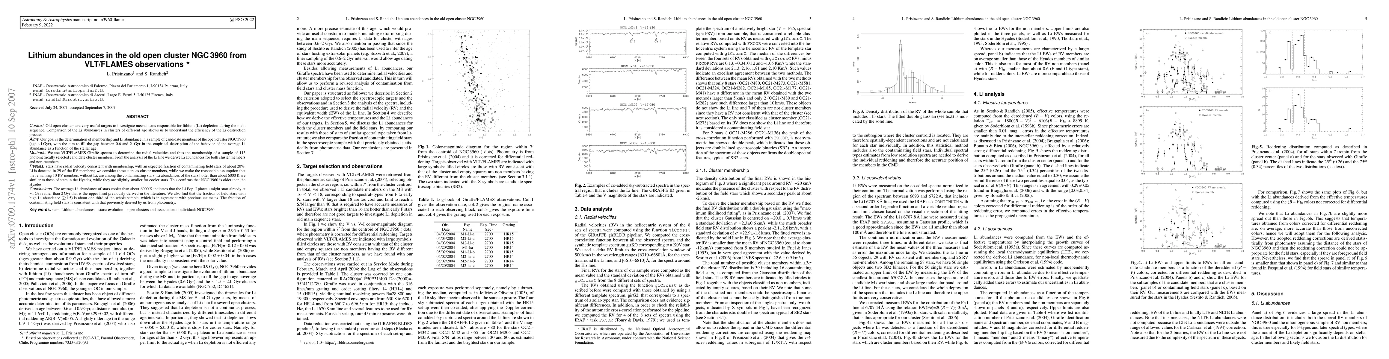 Old open clusters are very useful targets to investigate mechanisms responsible for lithium (Li) depletion during the main sequence. Comparison of the Li abundances in clusters of different age allows us to understand the efficiency of the Li destruction process. Our goal is the determination of membership and Li abundance in a sample of candidate members of the open cluster NGC 3960 (age ~1 Gyr), with the aim to fill the gap between 0.6 and 2 Gyr in the empirical description of the behavior of the average Li abundance as a function of the stellar age. We use VLT/FLAMES Giraffe spectra to determine the radial velocities and thus the membership of a sample of 113 photometrically selected candidate cluster members. From the analysis of the Li line we derive Li abundances for both cluster members and non-members. 39 stars have radial velocity consistent with membership, with an expected fraction of contaminating field stars of about 20%. Li is detected in 29 of the RV members; we consider these stars as cluster members, while we make the reasonable assumption that the remaining 10 RV members without Li, are among the contaminating stars. Li abundances of the stars hotter than about 6000 K are similar to those of stars in the Hyades, while they are slightly smaller for cooler stars. This confirms that NGC 3960 is older than the Hyades. The average Li abundance of stars cooler than about 6000 K indicates that the Li Pop. I plateau might start already at ~1 Gyr rather than 2 Gyr that is the upper limit previously derived in the literature. We also find that the fraction of field stars with high Li abundance (>1.5) is about one third of the whole sample, which is in agreement with previous estimates. The fraction of contaminating field stars is consistent with that previously derived by us from photometry.