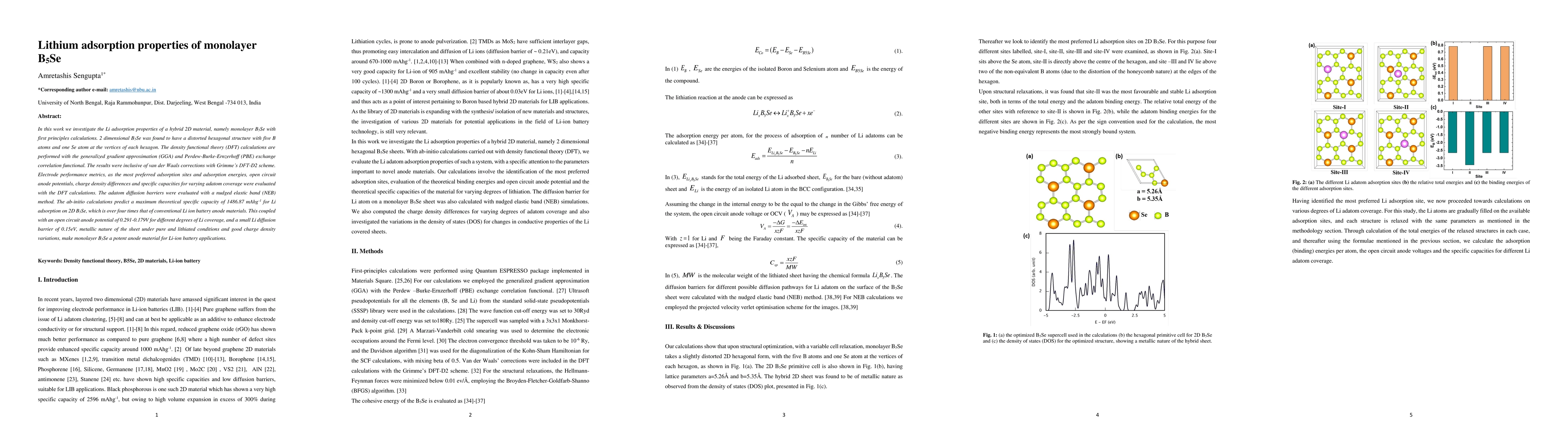 B$_5$Se this work we investigate the Li adsorption properties of a hybrid 2D material, namely monolayer B5Se with first principles calculations. 2 dimensional B$_5$Se was found to have a distorted hexagonal structure with five B atoms and one Se atom at the vertices of each hexagon. The density functional theory (DFT) calculations are performed with the generalized gradient approximation (GGA) and Perdew-Burke-Ernzerhoff (PBE) exchange correlation functional. The results were inclusive of van der Waals corrections with Grimmes DFT-D2 scheme. Electrode performance metrics, as the most preferred adsorption sites and adsorption energies, open circuit anode potentials, charge density differences and specific capacities for varying adatom coverage were evaluated with the DFT calculations. The adatom diffusion barriers were evaluated with a nudged elastic band (NEB) method. The ab-initio calculations predict a maximum theoretical specific capacity of 1486.87 mAhg$^{-1}$ for Li adsorption on 2D B$_5$Se, which is over four times that of conventional Li ion battery anode materials. This coupled with an open circuit anode potential of 0.291-0.179V for different degrees of Li coverage, and a small Li diffusion barrier of 0.15eV, metallic nature of the sheet under pure and lithiated conditions and good charge density variations, make monolayer B$_5$Se a potent anode material for Li-ion battery applications.