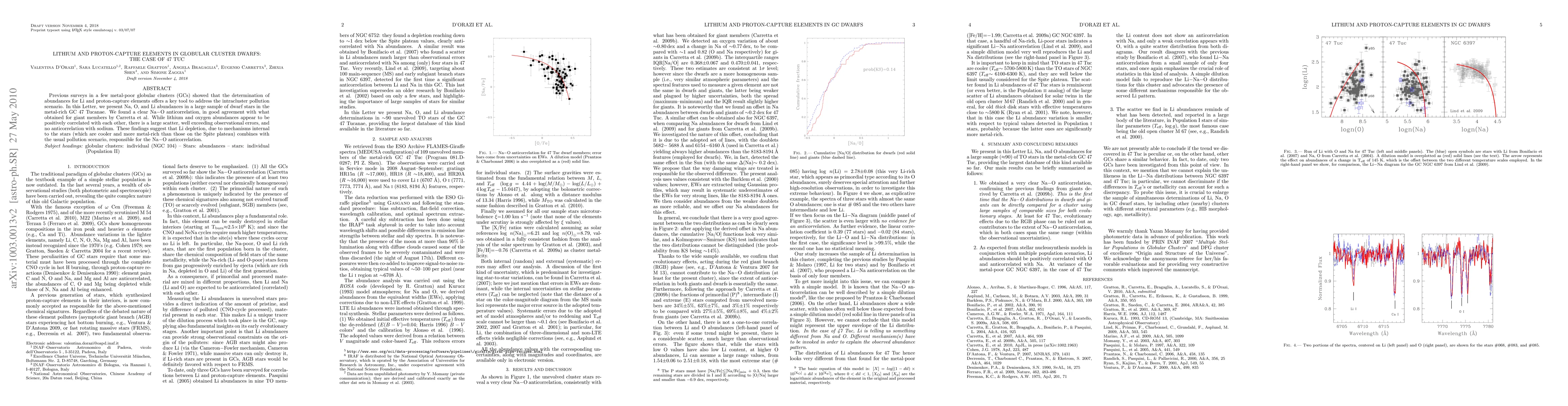 Previous surveys in a few metal-poor globular clusters (GCs) showed that the determination of abundances for Li and proton-capture elements offers a key tool to address the intracluster pollution scenario. In this Letter, we present Na, O, and Li abundances in a large sample of dwarf stars in the metal-rich GC 47 Tucanae. We found a clear Na-O anticorrelation, in good agreement with what obtained for giant members by Carretta et al. While lithium and oxygen abundances appear to be positively correlated with each other, there is a large scatter, well exceeding observational errors, and no anticorrelation with sodium. These findings suggest that Li depletion, due to mechanisms internal to the stars (which are cooler and more metal-rich than those on the Spite plateau), combines with the usual pollution scenario responsible for the Na-O anticorrelation.