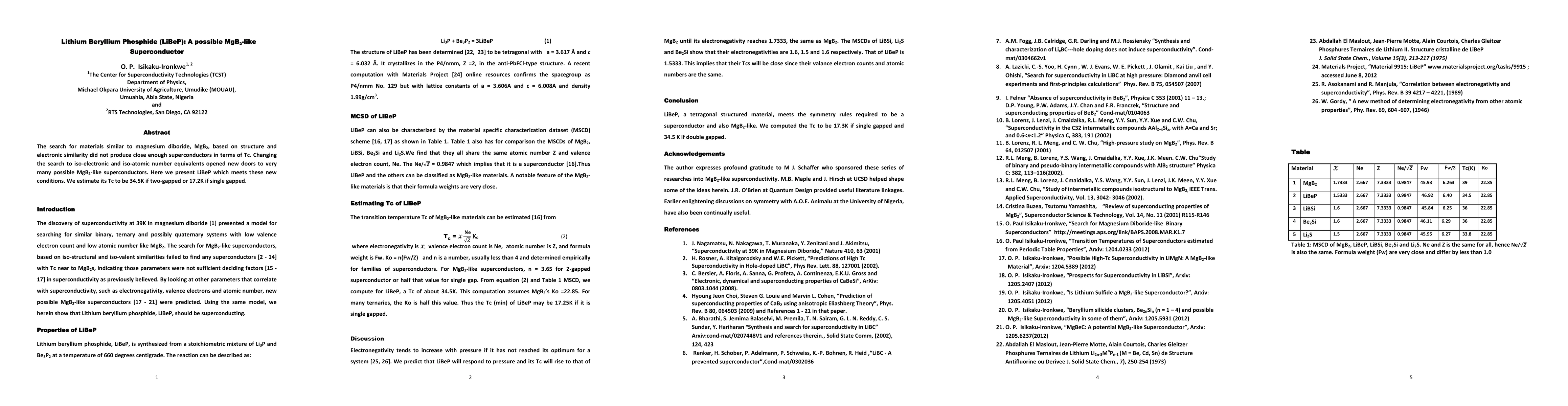 The search for materials similar to magnesium diboride, MgB2, based on structure and electronic similarity did not produce close enough superconductors in terms of Tc. Changing the search to iso-electronic and iso-atomic number equivalents opened new doors to very many possible MgB2-like superconductors. Here we present LiBeP which meets these new conditions. We estimate its Tc to be 34.5K if two-gapped or 17.2K if single gapped.