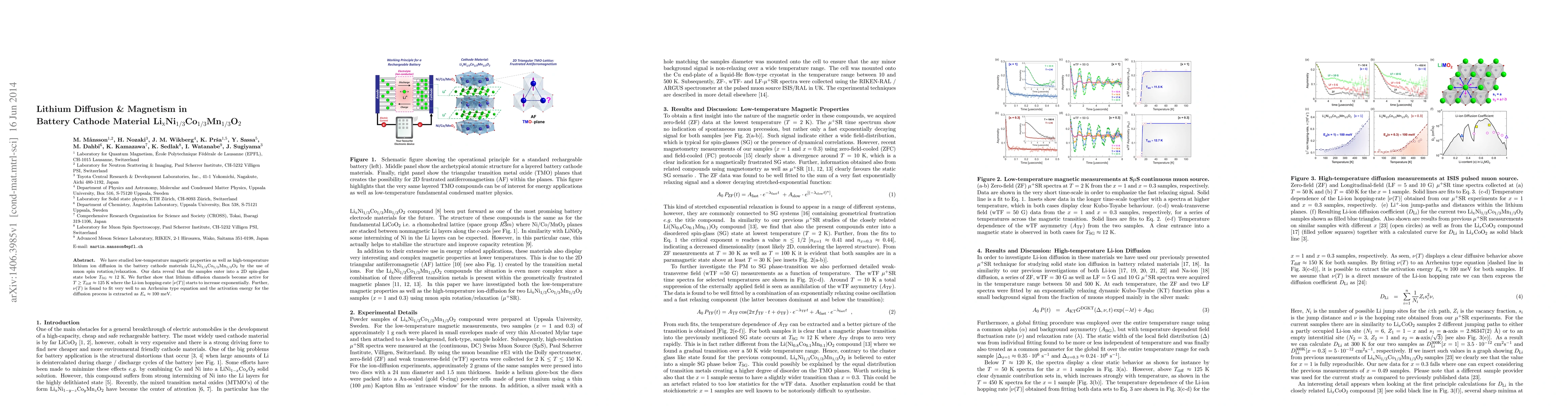 This study investigates lithium diffusion and magnetic properties in LixNi1/3Co1/3Mn1/3O2 cathode materials using muon spin rotation/relaxation. The research finds that the material exhibits a 2D spin-glass state below 12 K and activates lithium ion diffusion above 125 K, with an activation energy of 100 meV.