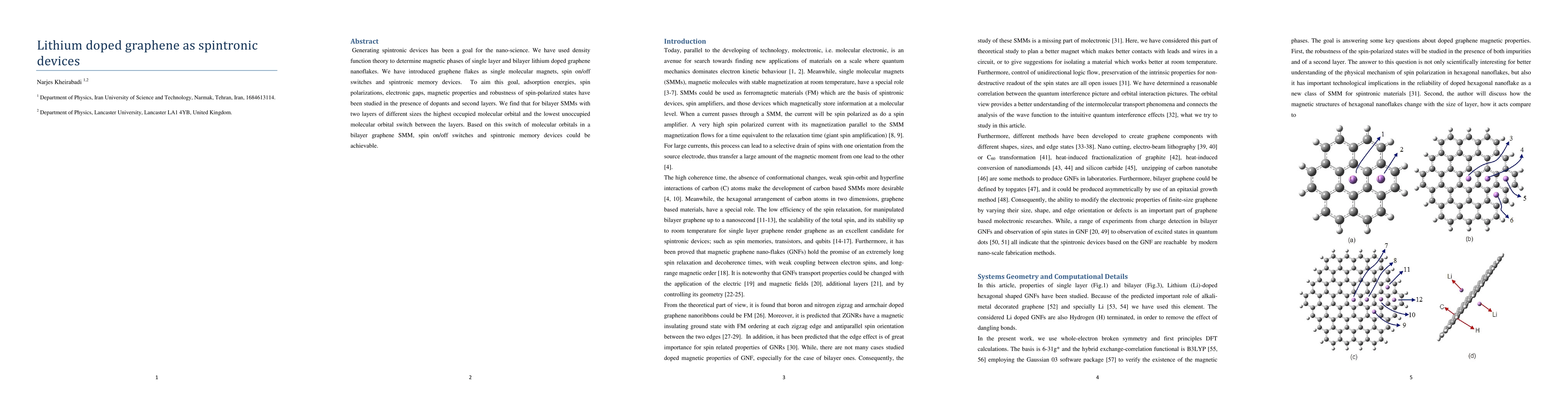 This paper investigates lithium-doped graphene nanoflakes for spintronic applications using density functional theory, finding magnetic phases and potential for single molecular magnets, spin switches, and memory devices through studying adsorption energies, spin polarizations, and electronic properties. Bilayer configurations show switching of molecular orbitals, suggesting feasible spintronic devices.