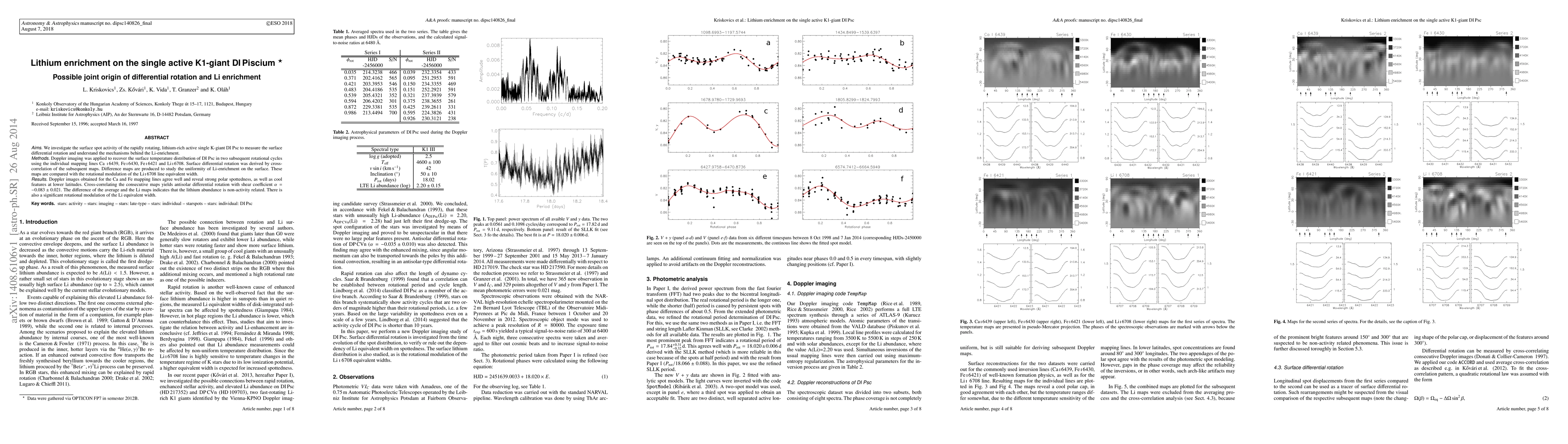 This paper investigates the surface differential rotation and lithium enrichment in the K-giant DI Piscium using Doppler imaging techniques. The study reveals antisolar differential rotation and a non-uniform lithium distribution, suggesting a possible joint origin for both phenomena.