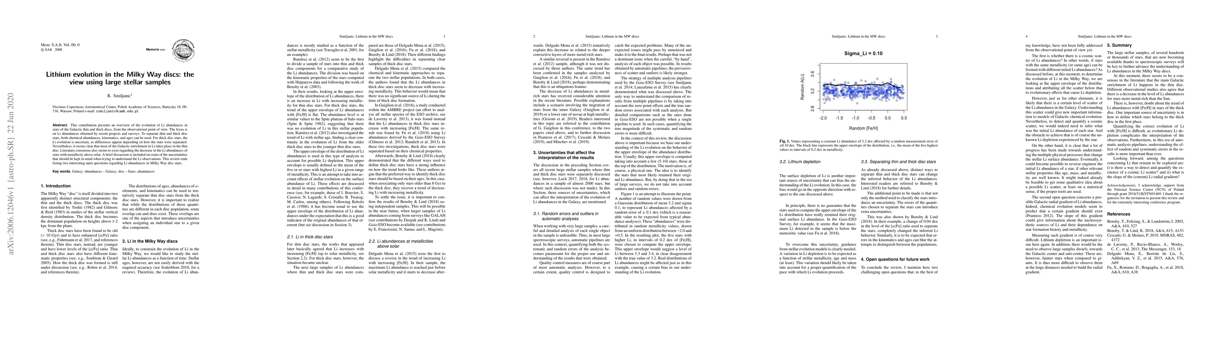 The paper reviews lithium evolution in Milky Way discs, finding most enrichment occurs in thin discs, with decreasing Li abundances for stars above solar metallicity.