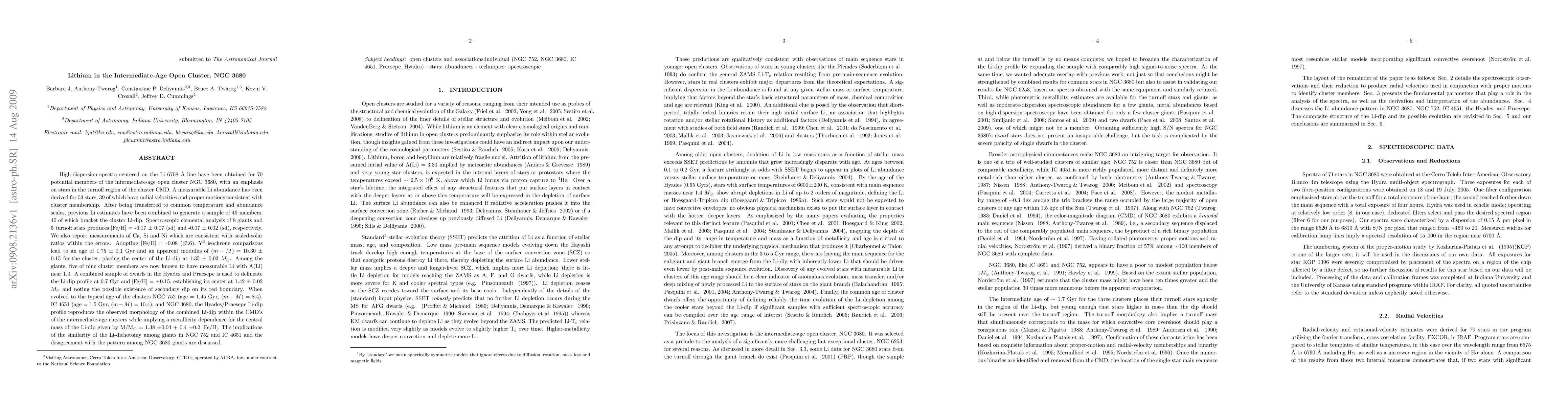 High-dispersion spectra centered on the Li 6708 A line have been obtained for 70 potential members of the open cluster NGC 3680, with an emphasis on stars in the turnoff region. A measurable Li abundance has been derived for 53 stars, 39 of which have radial velocities and proper motions consistent with cluster membership. After being transferred to common temperature and abundance scales, previous Li estimates have been combined to generate a sample of 49 members, 40 of which bracket the cluster Li-dip. Spectroscopic elemental analysis of 8 giants and 5 turnoff stars produces [Fe/H] = -0.17 +/- 0.07 (sd) and -0.07 +/- 0.02 (sd), respectively. We also report measurements of Ca, Si and Ni which are consistent with scaled-solar ratios within the errors. Adopting [Fe/H] = -0.08 (Sect. 3.6), Y^2 isochrone comparisons lead to an age of 1.75 +/- 0.10 Gyr and an apparent modulus of (m-M) = 10.30 +/- 0.15 for the cluster, placing the center of the Li-dip at 1.35 +/- 0.03 solar masses. Among the giants, 5 of 9 cluster members are now known to have measurable Li with A(Li) near 1.0. A combined sample of dwarfs in the Hyades and Praesepe is used to delineate the Li-dip profile at 0.7 Gyr and [Fe/H] = +0.15, establishing its center at 1.42 +/- 0.02 solar masses and noting the possible existence of secondary dip on its red boundary. When evolved to the typical age of the clusters NGC 752, IC 4651 and NGC 3680, the Hyades/Praesepe Li-dip profile reproduces the observed morphology of the combined Li-dip within the CMD's of the intermediate-age clusters while implying a metallicity dependence for the central mass of the Li-dip given by Mass = (1.38 +/-0.04) + (0.4 +/- 0.2)[Fe/H]. The implications of the similarity of the Li-dichotomy among giants in NGC 752 and IC 4651 and the disagreement with the pattern among NGC 3680 giants are discussed.