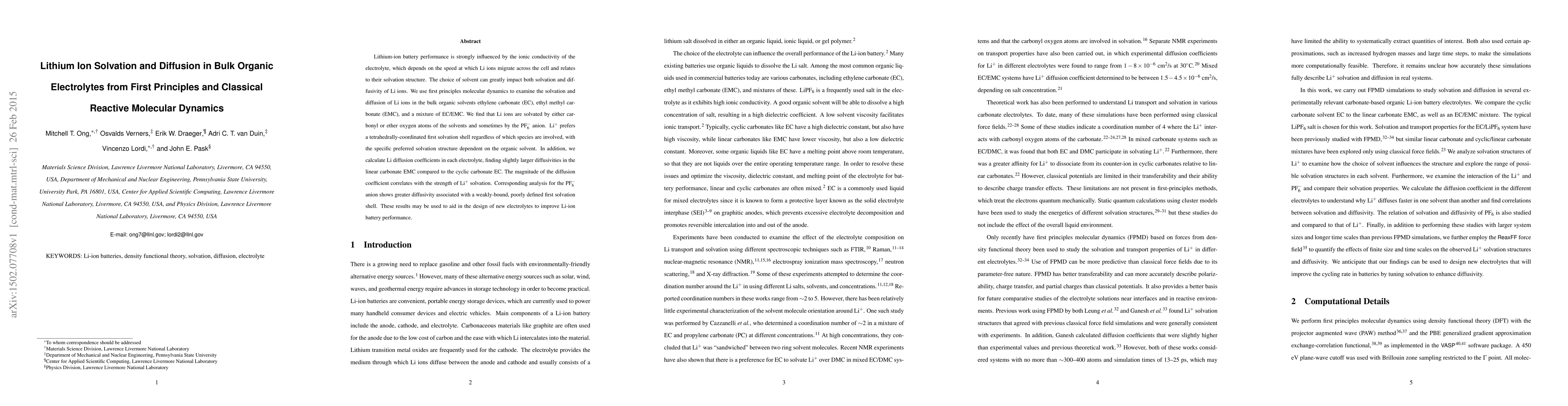 This study uses first principles and classical reactive molecular dynamics to investigate the solvation and diffusion of Li ions in organic electrolytes, finding that Li ions prefer tetrahedral solvation by carbonyl or ether oxygen atoms, with diffusion rates correlating to the strength of Li ion solvation. EMC shows slightly higher Li diffusion compared to EC, aiding in the design of better Li-ion batteries.