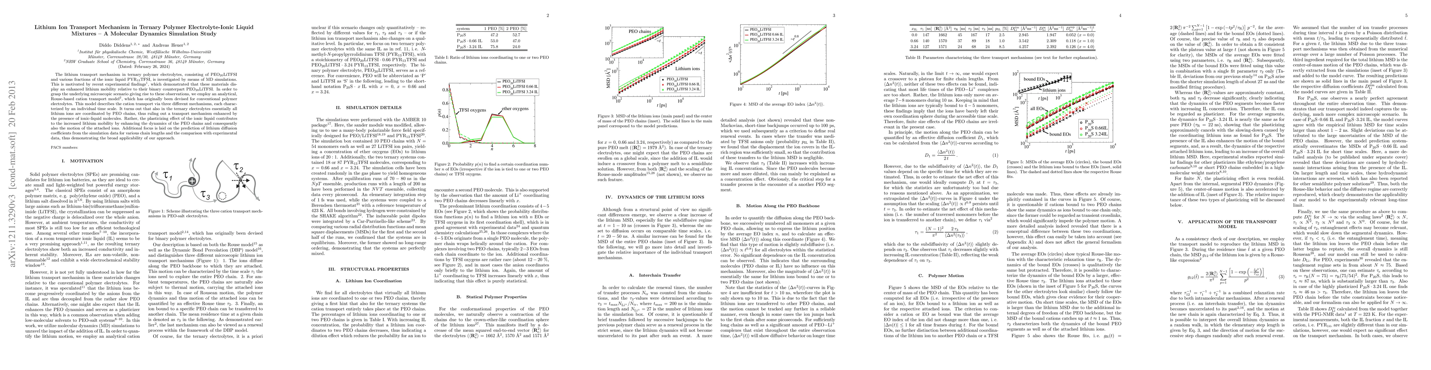 This study uses molecular dynamics simulations to investigate lithium transport in ternary polymer electrolytes consisting of PEO/LiTFSI and ionic liquid mixtures. The research finds that the ionic liquid enhances lithium mobility by increasing the dynamics of PEO chains, rather than through direct ionic-liquid coordination, and validates the findings with predicted lithium diffusion coefficients.