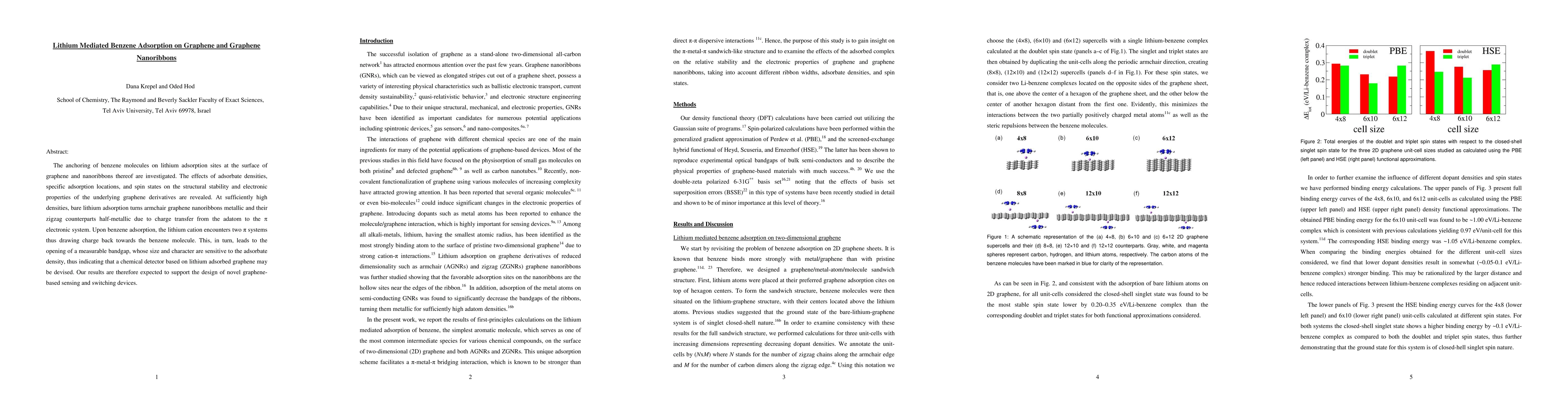 The paper presents a comprehensive DFT analysis of lithium-mediated benzene adsorption on 2D graphene and GNRs, revealing insights into structural stability and electronic property modifications.