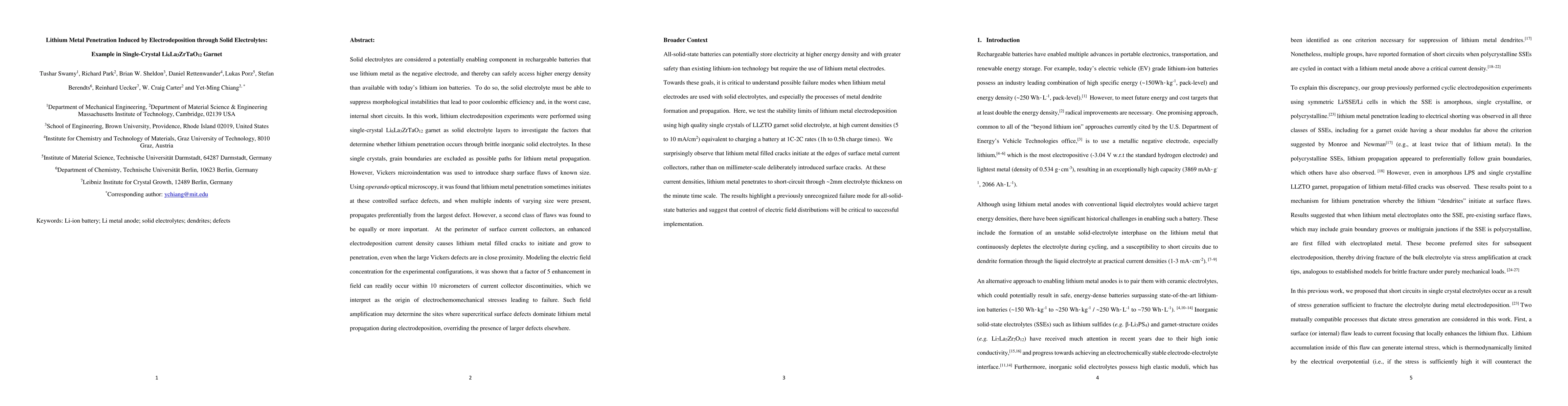 This study investigates lithium metal penetration through single-crystal Li6La3ZrTaO12 garnet solid electrolytes, finding that controlled surface flaws and current collector discontinuities significantly influence penetration. The research highlights that electric field concentration near current collector edges can lead to electrochemomechanical stresses, determining where supercritical defects dominate lithium propagation.