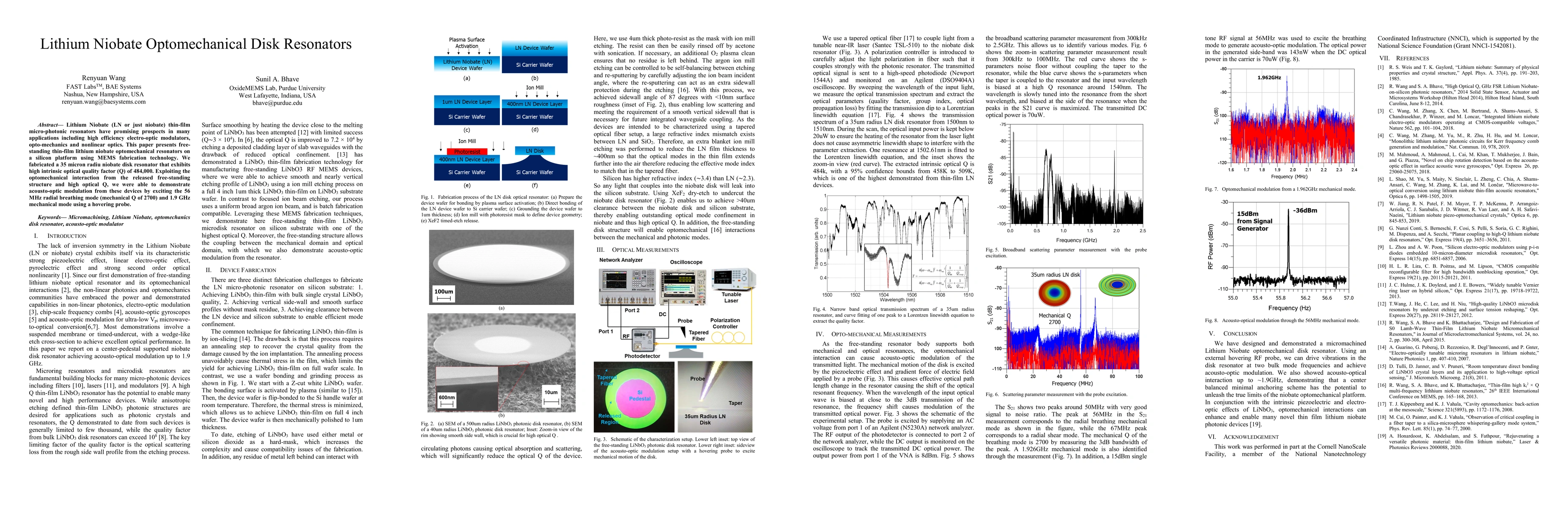 This research develops free-standing thin-film lithium niobate resonators on silicon using MEMS technology, achieving a high optical quality factor (Q) of 484,000, and demonstrates acousto-optic modulation by exciting a radial breathing mechanical mode at 56MHz.