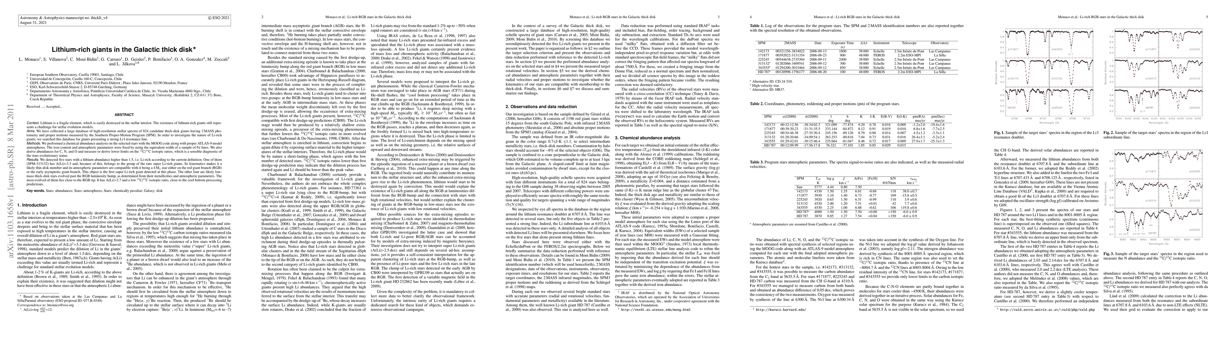 Context: Lithium is a fragile element, which is easily destroyed in the stellar interior. The existence of lithium-rich giants still represents a challenge for stellar evolution models. Aims: We have collected a large database of high-resolution stellar spectra of 824 candidate thick-disk giants having 2\,MASS photometry and proper motions measured by the Southern Proper-Motion Program (SPM). In order to investigate the nature of Li-rich giants, we searched this database for giants presenting a strong Li\,I resonance line. Methods: We performed a chemical abundance analysis on the selected stars with the MOOG code along with proper ATLAS-9 model atmospheres. The iron content and atmospheric parameters were fixed by using the equivalent width of a sample of Fe lines. We also derive abundances for C, N, and O and measure or derive lower limits on the $^{12}$C/$^{13}$C isotopic ratios, which is a sensible diagnostic of the stars evolutionary status. Results: We detected five stars with a lithium abundance higher than 1.5, i.e. Li-rich according to the current definition. One of them (SPM-313132) has A(Li)$>$3.3 and, because of this, belongs to the group of the rare super Li-rich giants. Its kinematics makes it a likely thin-disk member and its atmospheric parameters are compatible with it being a 4\,M$_\odot$ star either on the red giant branch (RGB) or the early asymptotic giant branch. This object is the first super Li-rich giant detected at this phase. The other four are likely low-mass thick-disk stars evolved past the RGB luminosity bump, as determined from their metallicities and atmospheric parameters. The most evolved of them lies close to the RGB-tip. It has A(Li)$>$2.7 and a low $^{12}$C/$^{13}$C isotopic ratio, close to the cool bottom processing predictions.