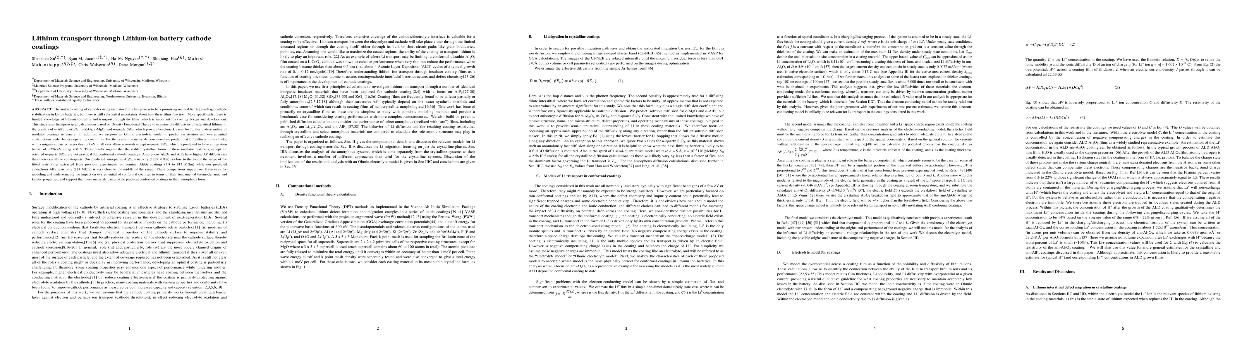 This study investigates lithium transport through various crystalline and amorphous insulator coatings on Li-ion battery cathodes using Density Functional Theory. It finds that while crystalline coatings have low lithium diffusivity, amorphous forms like $Al_2O_3$ and $AlF_3$ exhibit higher diffusivity, suggesting they could be more practical for conformal cathode coatings.