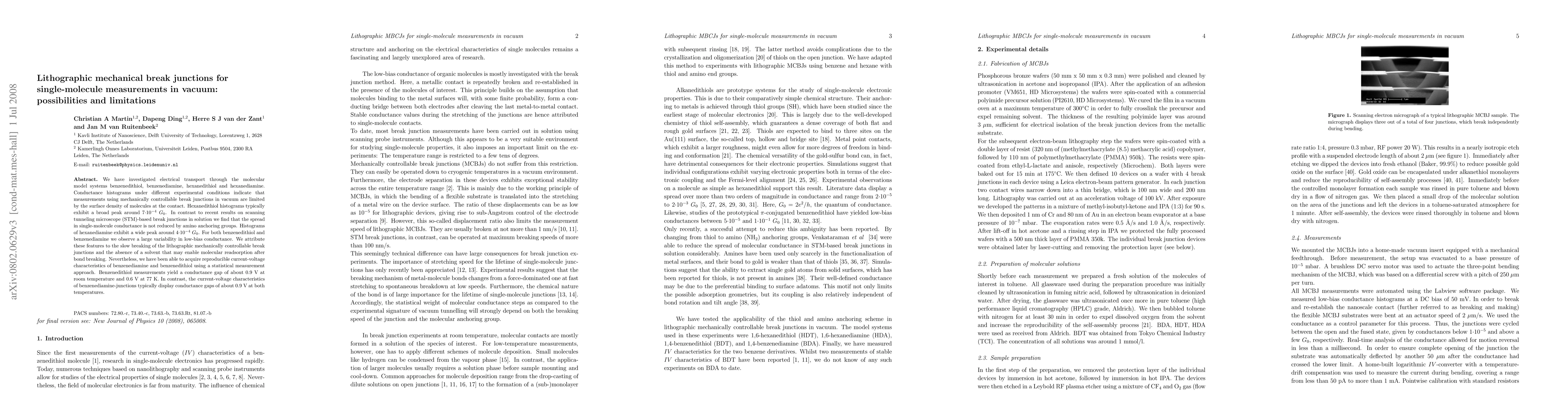 This paper investigates electrical transport through various molecular systems using lithographic mechanical break junctions in vacuum, finding that surface density limits conductance measurements. The study highlights the broad peaks in conductance histograms for hexanedithiol and hexanediamine, with amino groups not reducing spread in conductance, and large variability in low-bias conductance for benzenedithiol and benzenediamine, attributed to junction breaking mechanics and solvent absence.