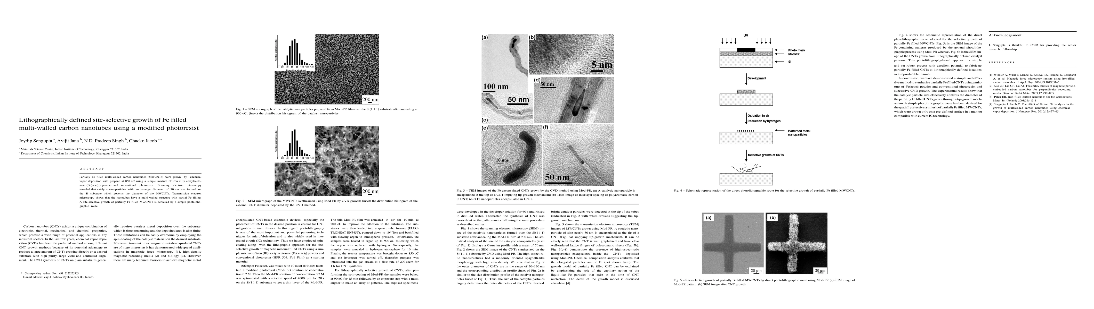 This paper describes a method for site-selective growth of partially Fe filled multi-walled carbon nanotubes using a modified photoresist and chemical vapor deposition. The process results in Fe-filled nanotubes with a multi-walled structure, achieved through a photolithographic technique.