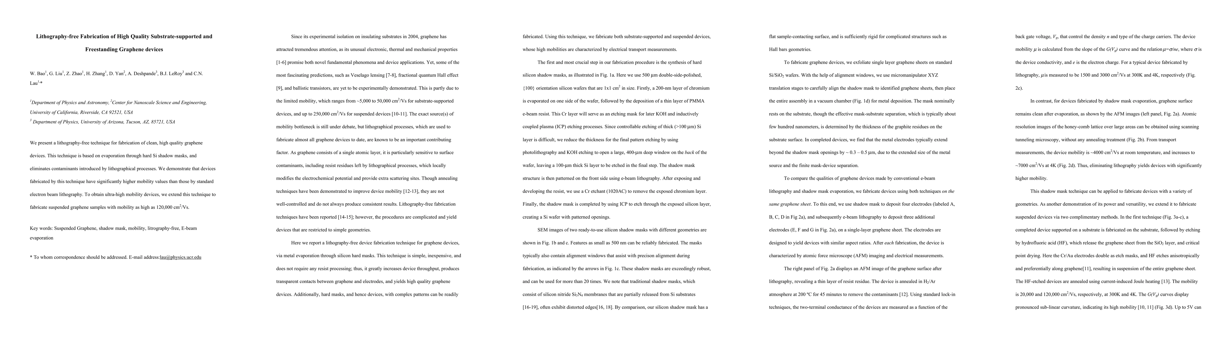 This paper introduces a lithography-free method for creating high-quality graphene devices using Si shadow masks, achieving significantly higher mobility compared to traditional lithography. It also extends the technique to produce freestanding graphene with an ultra-high mobility of 120,000 cm^2/Vs.