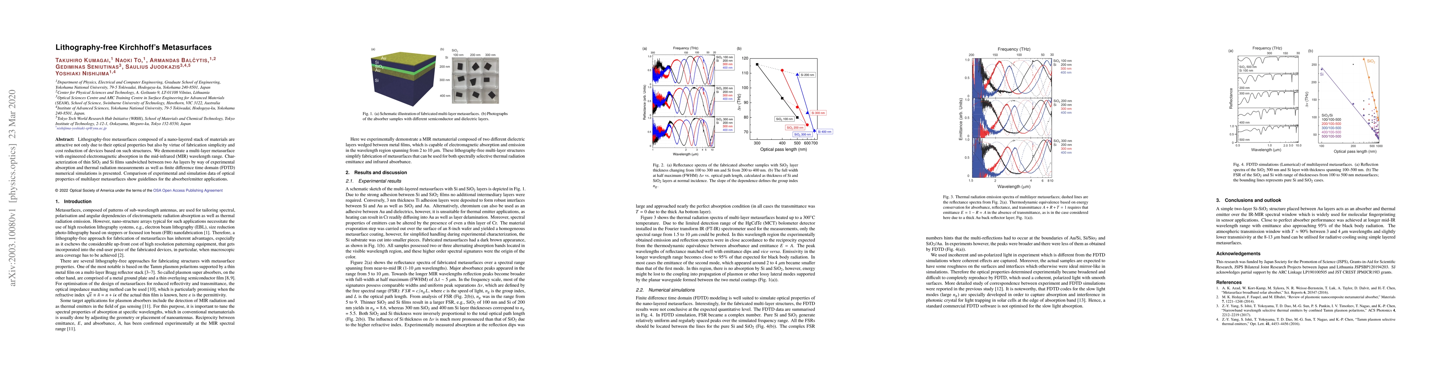 Lithography-free metasurfaces composed of a nano-layered stack of materials are attractive not only due to their optical properties but also by virtue of fabrication simplicity and cost reduction of devices based on such structures. We demonstrate a multi-layer metasurface with engineered electromagnetic absorption in the mid-infrared (MIR) wavelength range. Characterisation of thin SiO$_2$ and Si films sandwiched between two Au layers by way of experimental absorption and thermal radiation measurements as well as finite difference time domain (FDTD) numerical simulations is presented. Comparison of experimental and simulation data of optical properties of multilayer metasurfaces show guidelines for the absorber/emitter applications.