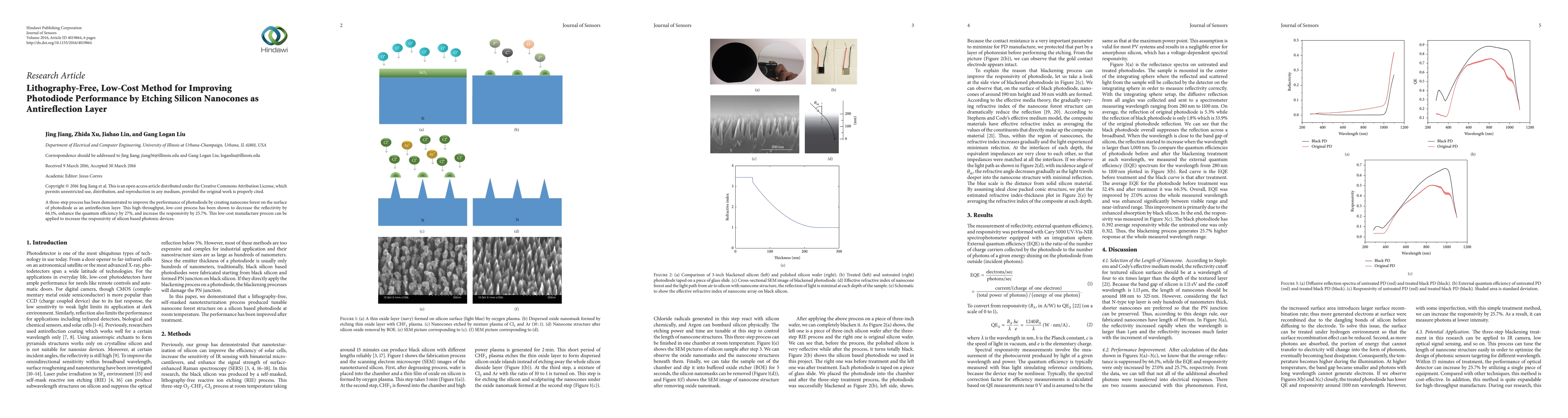 This research presents a three-step, lithography-free method to enhance photodiode performance by etching silicon nanocones as an antireflection layer, achieving a 66.1% reduction in reflectivity, a 27% increase in quantum efficiency, and a 25.7% boost in responsivity. The low-cost process is scalable for improving silicon-based photonic devices.
