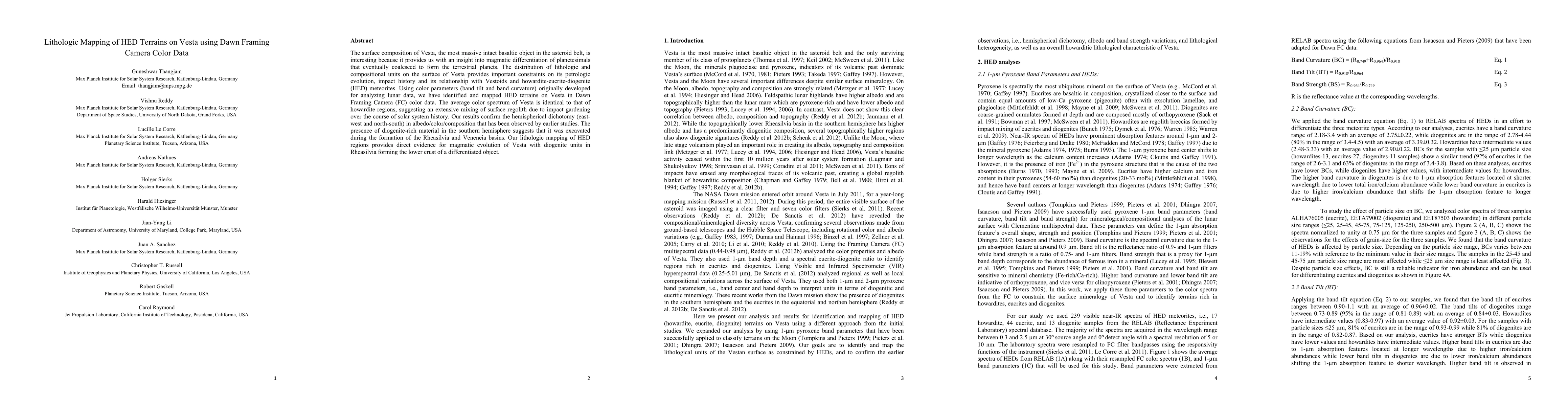This study uses Dawn Framing Camera color data to map HED terrains on Vesta, revealing insights into its magmatic differentiation and impact history. The analysis confirms a hemispherical dichotomy in color/composition and identifies diogenite-rich material in the southern hemisphere, indicating its excavation during basin formation.