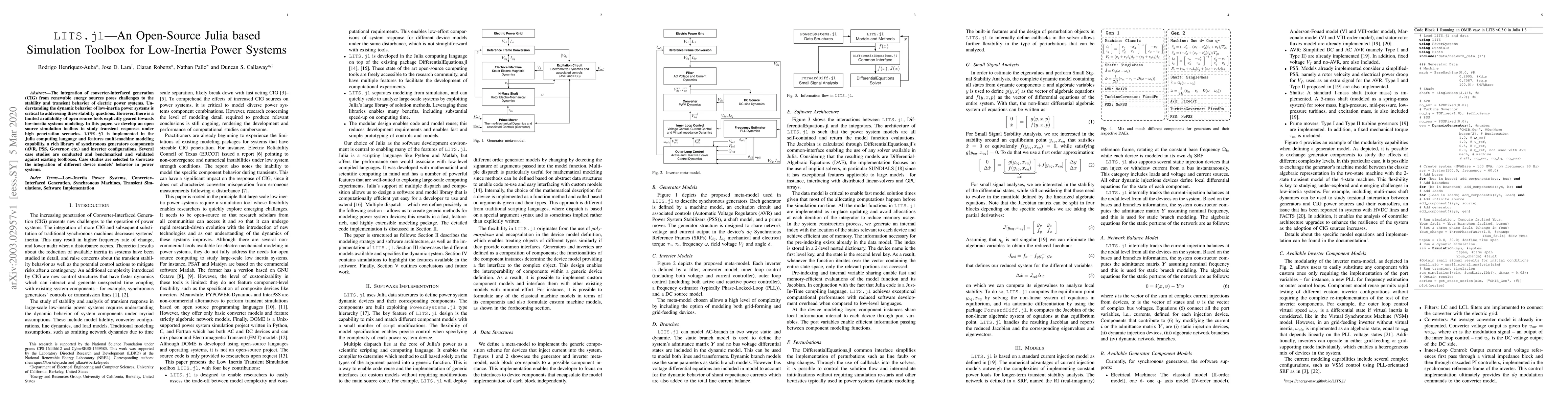 LITS.jl is an open-source Julia-based simulation toolbox designed to model and analyze low-inertia power systems with high penetration of renewable energy sources. It features multi-machine modeling and a comprehensive library of synchronous generator components, validated through various case studies.