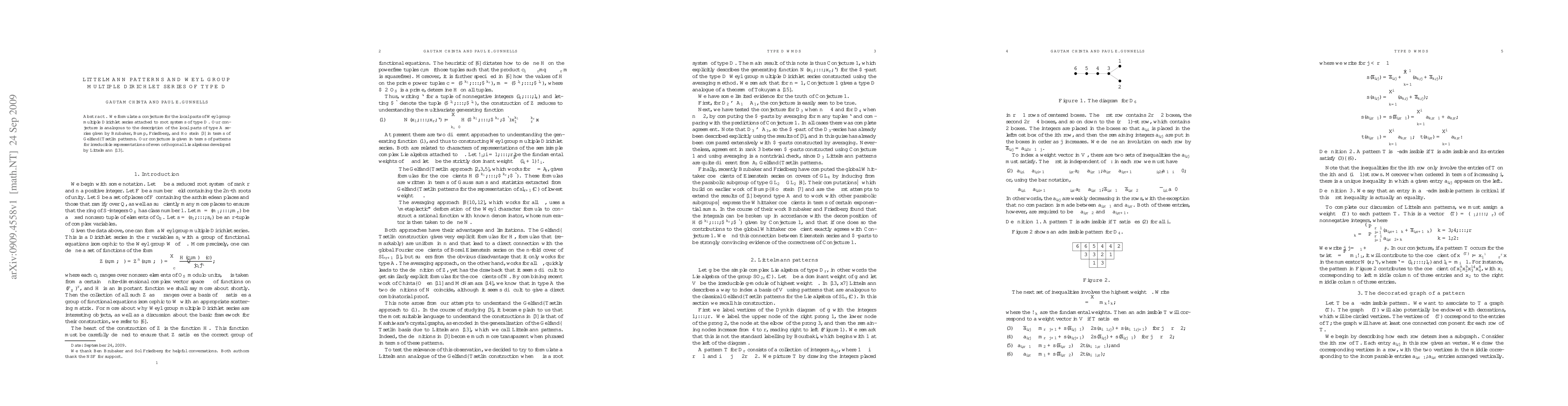 The research formulates a conjecture for the local parts of Weyl group multiple Dirichlet series attached to root systems of type D, using Littelmann patterns analogous to Gelfand--Tsetlin patterns for type A series.