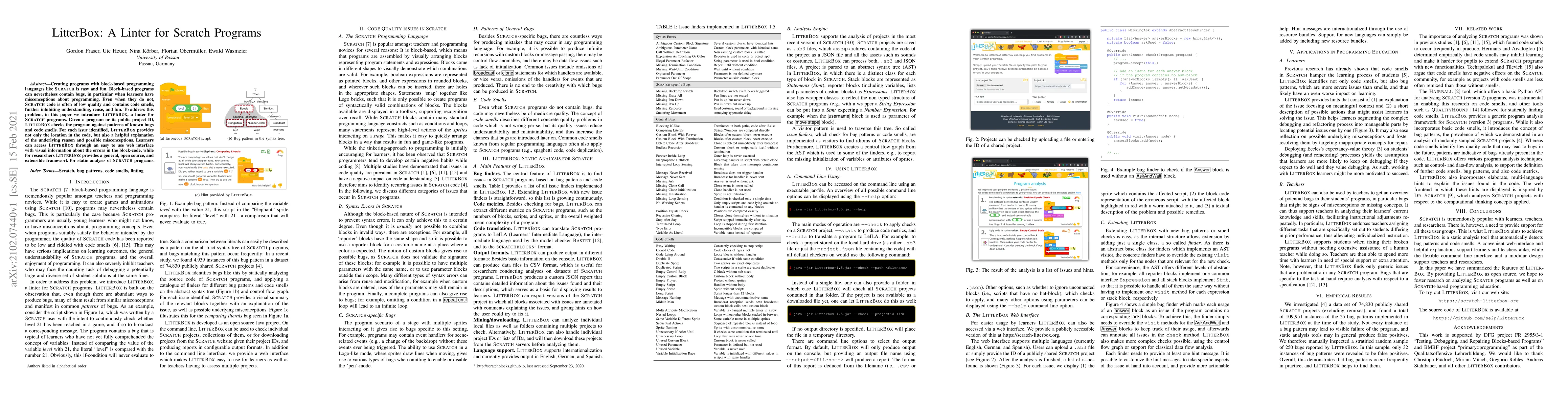 LitterBox is a linter designed to detect bugs and code smells in Scratch programs, offering explanations to help learners understand and correct issues. It provides a web interface for users and an open-source framework for researchers to analyze Scratch code.