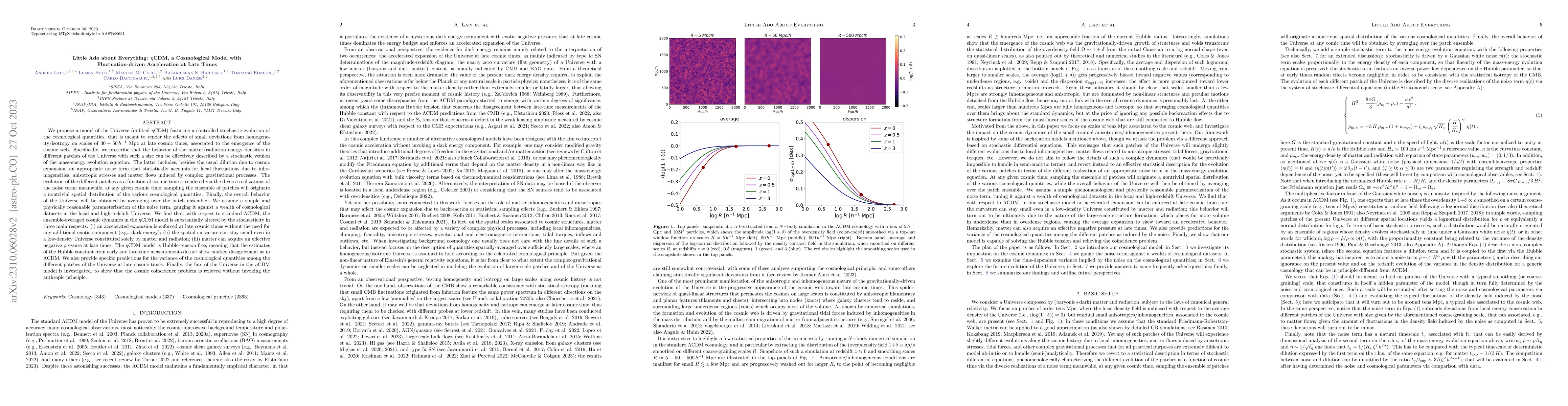The $\eta$CDM model proposes a stochastic evolution of cosmological quantities to explain late-time acceleration without dark energy, a small spatial curvature in low-density universes, and effective negative pressure in matter. It resolves the Hubble tension and cosmic coincidence problem without anthropic arguments.