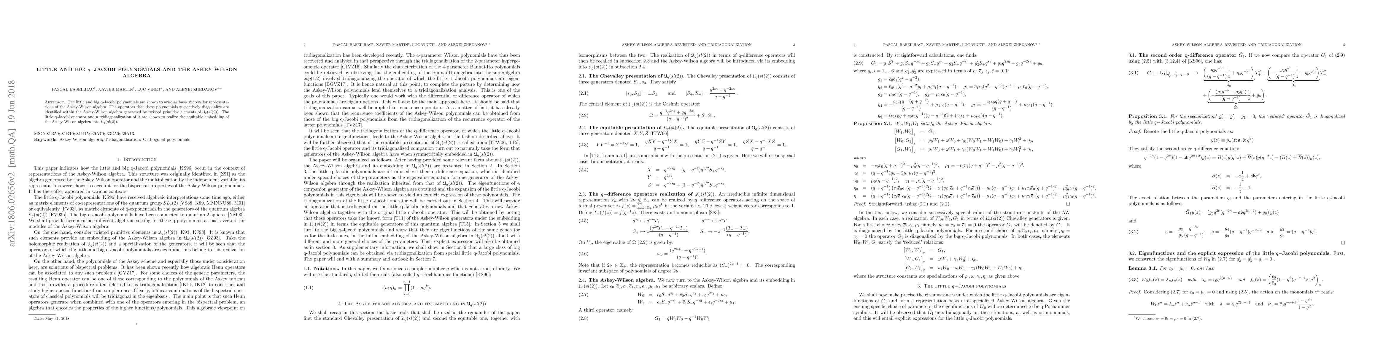 The little and big q-Jacobi polynomials are shown to arise as basis vectors for representations of the Askey-Wilson algebra. The operators that these polynomials respectively diagonalize are identified within the Askey-Wilson algebra generated by twisted primitive elements of $\mathfrak U_q(sl(2))$. The little q-Jacobi operator and a tridiagonalization of it are shown to realize the equitable embedding of the Askey-Wilson algebra into $\mathfrak U_q(sl(2))$.