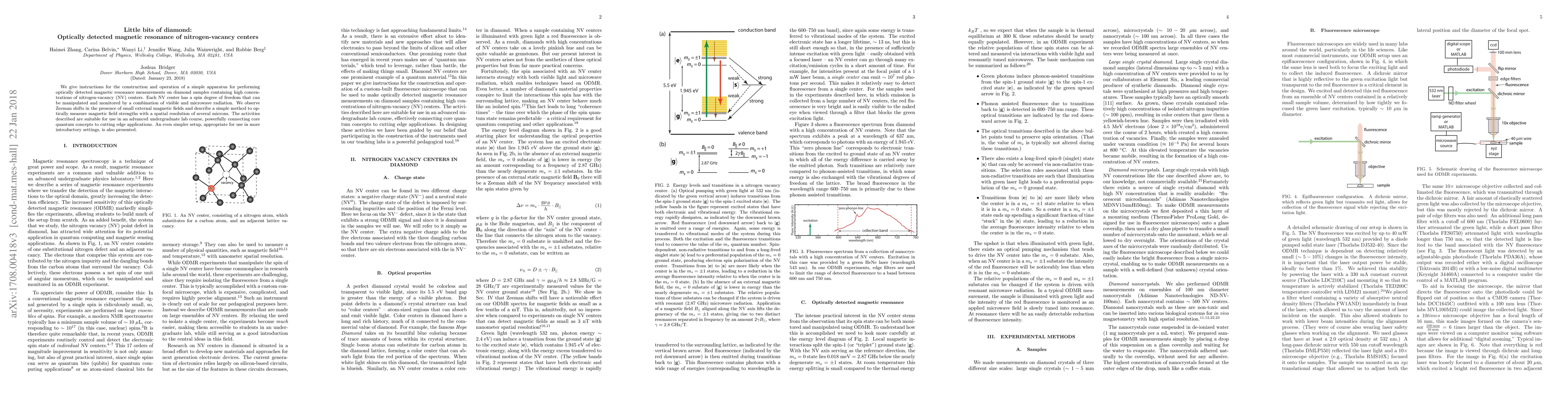 This paper details a simple apparatus for optically detecting magnetic resonance in diamond samples with nitrogen-vacancy centers, demonstrating Zeeman shifts and magnetic field measurement with micron-scale resolution. It serves as a bridge for advanced quantum concepts in undergraduate labs, with a simpler version for introductory settings.