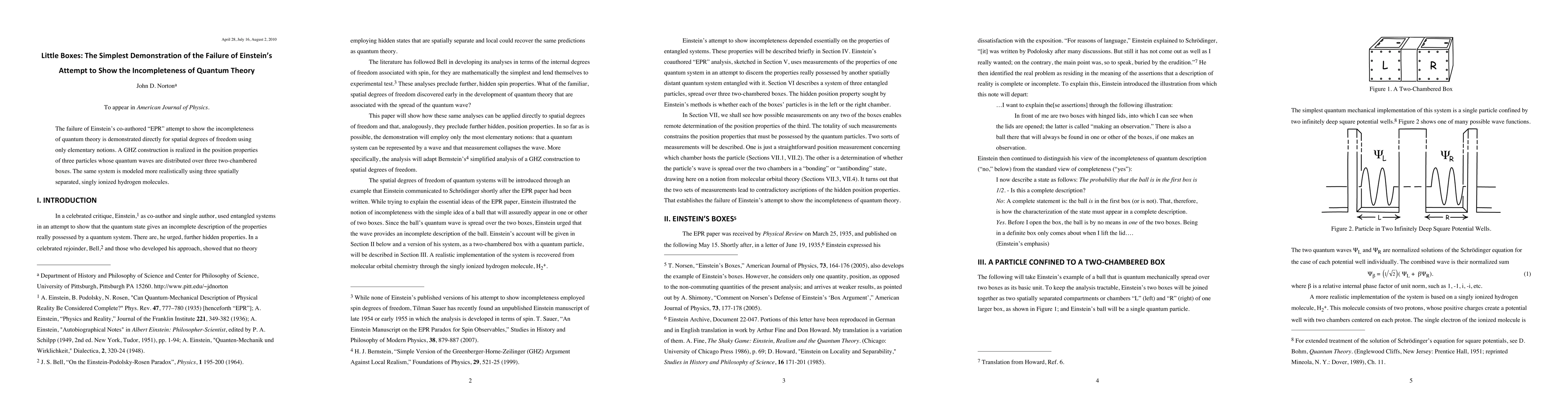 The failure of Einstein's co-authored "EPR" attempt to show the incompleteness of quantum theory is demonstrated directly for spatial degrees of freedom using only elementary notions. A GHZ construction is realized in the position properties of three particles whose quantum waves are distributed over three two-chambered boxes. The same system is modeled more realistically using three spatially separated, singly ionized hydrogen molecules.