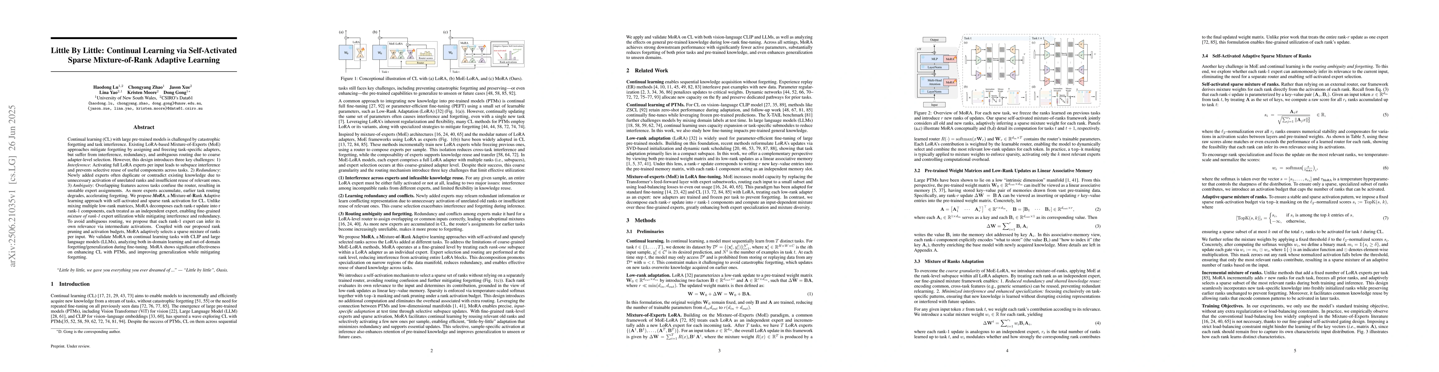 Continual learning (CL) with large pre-trained models is challenged by catastrophic forgetting and task interference. Existing LoRA-based Mixture-of-Experts (MoE) approaches mitigate forgetting by assigning and freezing task-specific adapters, but suffer from interference, redundancy, and ambiguous routing due to coarse adapter-level selection. However, this design introduces three key challenges: 1) Interference: Activating full LoRA experts per input leads to subspace interference and prevents selective reuse of useful components across tasks. 2) Redundancy: Newly added experts often duplicate or contradict existing knowledge due to unnecessary activation of unrelated ranks and insufficient reuse of relevant ones. 3) Ambiguity: Overlapping features across tasks confuse the router, resulting in unstable expert assignments. As more experts accumulate, earlier task routing degrades, accelerating forgetting. We propose MoRA, a Mixture-of-Rank Adaptive learning approach with self-activated and sparse rank activation for CL. Unlike mixing multiple low-rank matrices, MoRA decomposes each rank-r update into r rank-1 components, each treated as an independent expert, enabling fine-grained mixture of rank-1 expert utilization while mitigating interference and redundancy. To avoid ambiguous routing, we propose that each rank-1 expert can infer its own relevance via intermediate activations. Coupled with our proposed rank pruning and activation budgets, MoRA adaptively selects a sparse mixture of ranks per input. We validate MoRA on continual learning tasks with CLIP and large language models (LLMs), analyzing both in-domain learning and out-of-domain forgetting/generalization during fine-tuning. MoRA shows significant effectiveness on enhancing CL with PTMs, and improving generalization while mitigating forgetting.