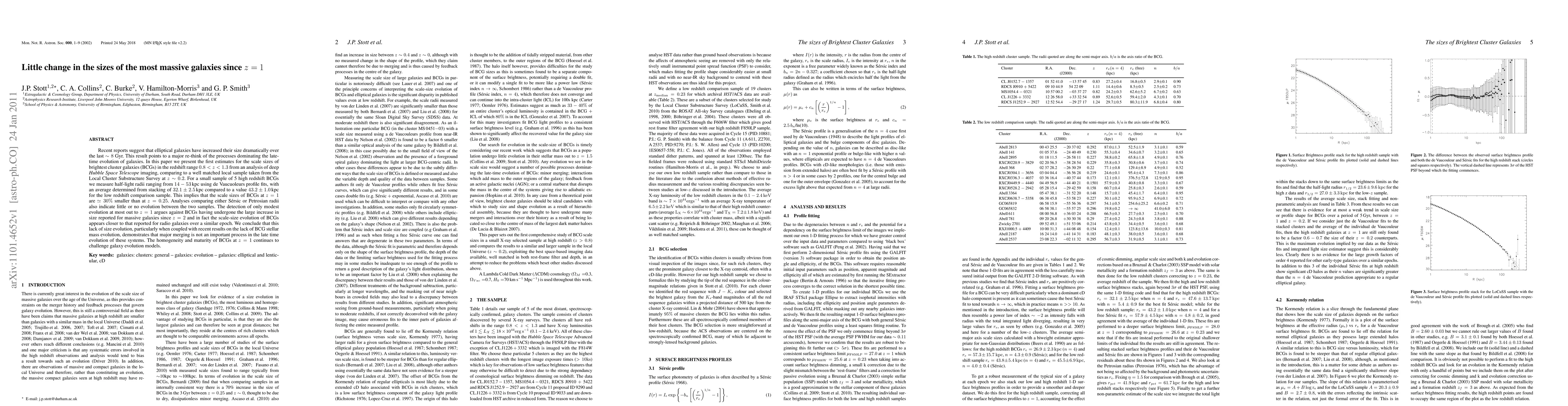This paper finds little change in the sizes of the most massive galaxies, specifically brightest cluster galaxies (BCGs), from redshift z = 1 to the present day, challenging previous reports of significant size increases. The study indicates that BCGs at z = 1 are ~30% smaller than their low redshift counterparts, suggesting that major merging is not a dominant factor in their late-time evolution.