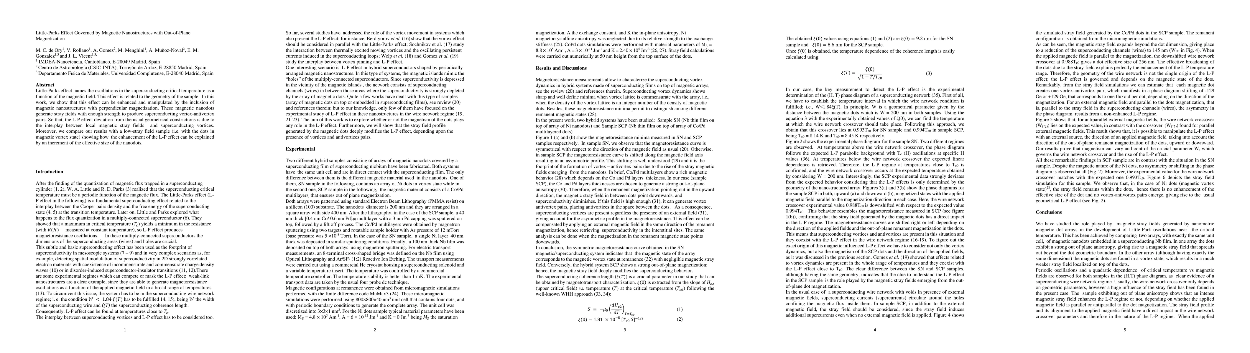 This paper explores how magnetic nanostructures with out-of-plane magnetization can enhance the Little-Parks effect, leading to oscillations in the superconducting critical temperature. The study reveals that stray fields from these nanodots create vortex-antivortex pairs, altering the effect's behavior and demonstrating that the enhancement can be attributed to an increased effective size of the nanodots.