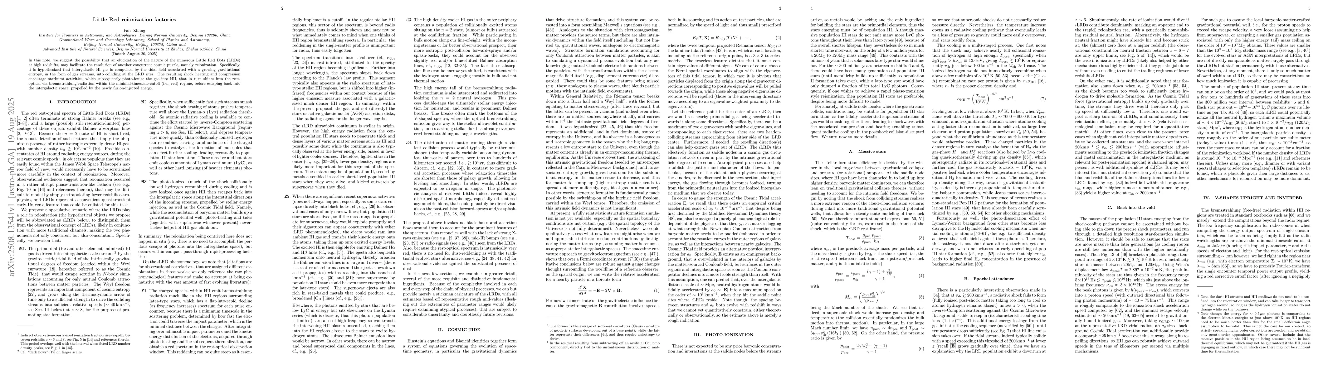 The paper proposes a theoretical model suggesting that Little Red Dots (LRDs) at high redshifts could be 'reionization factories', where tidal forces drive gas streams into starburst activities, photo-ionizing neutral hydrogen into HII regions that emit radiation in the rest-optical via bremsstrahlung before escaping back into intergalactic space.