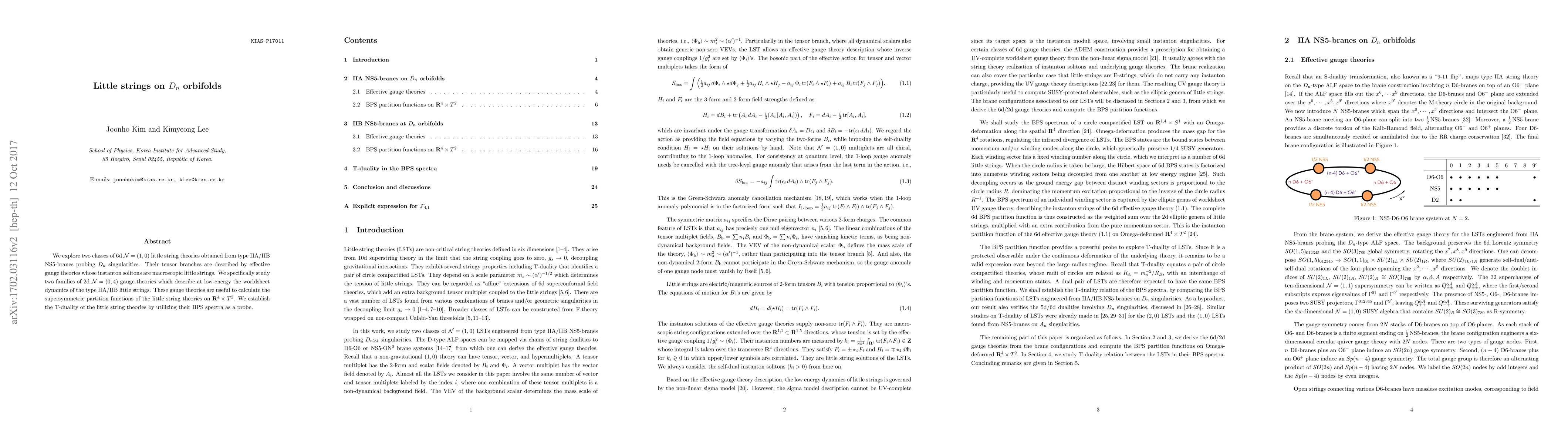 We explore two classes of 6d $\mathcal{N}=(1,0)$ little string theories obtained from type IIA/IIB NS5-branes probing $D_n$ singularities. Their tensor branches are described by effective gauge theories whose instanton solitons are macroscopic little strings. We specifically study two families of 2d $\mathcal{N}=(0,4)$ gauge theories which describe at low energy the worldsheet dynamics of the type IIA/IIB little strings. These gauge theories are useful to calculate the supersymmetric partition functions of the little string theories on $\mathbf{R}^4 \times T^2$. We establish the T-duality of the little string theories by utilizing their BPS spectra as a probe.