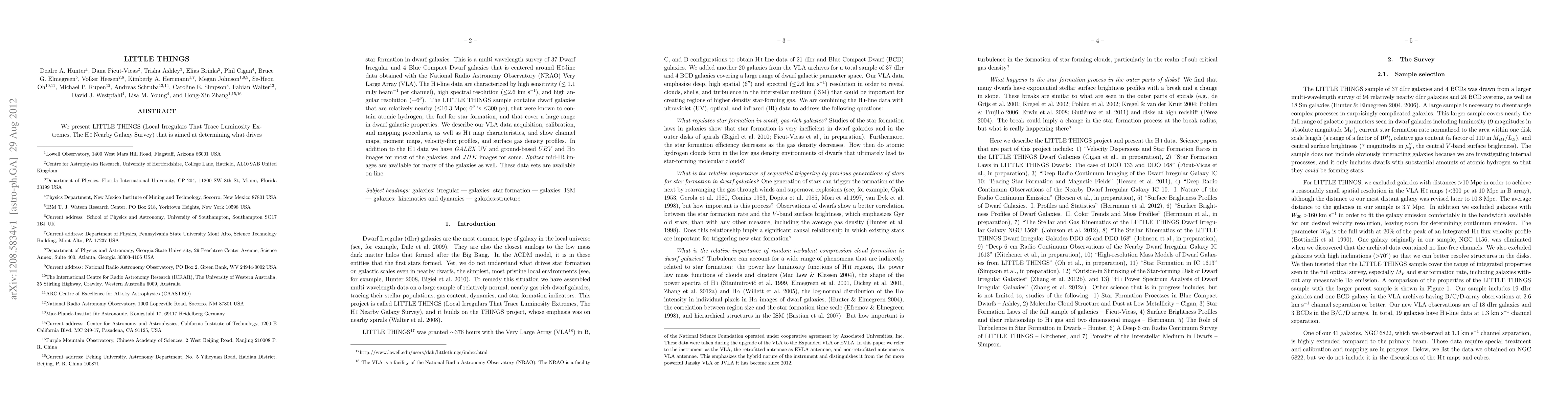 LITTLE THINGS is a multi-wavelength survey focused on determining the drivers of star formation in nearby dwarf galaxies, utilizing high-resolution HI-line data from the VLA. The survey includes 37 Dwarf Irregular and 4 Blue Compact Dwarf galaxies, providing comprehensive data sets for analysis.