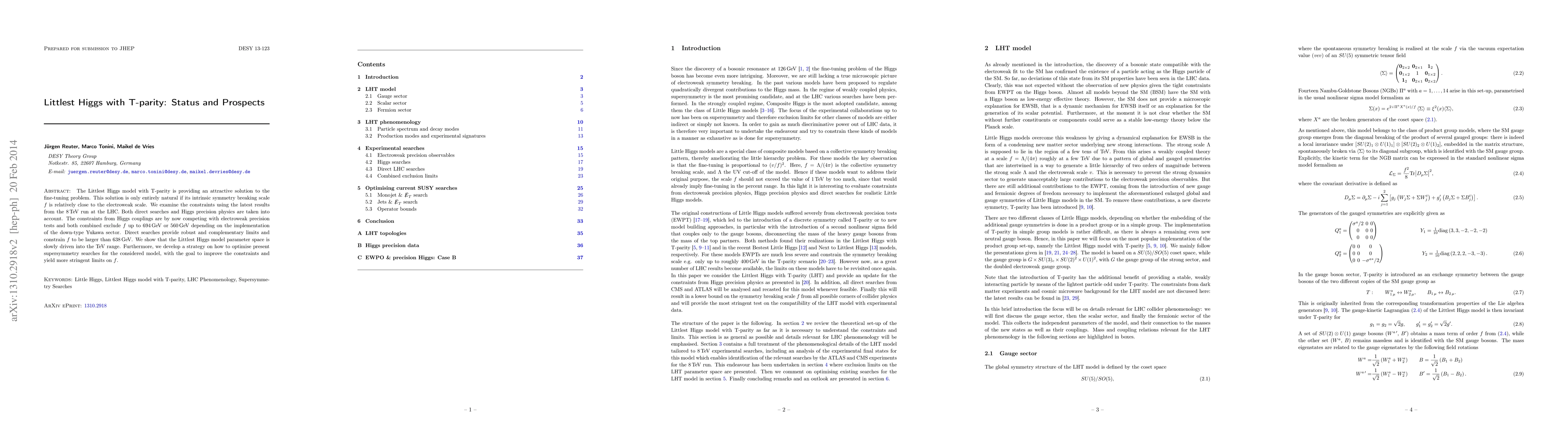 The Littlest Higgs model with T-parity addresses the fine-tuning problem, with constraints from LHC data excluding intrinsic symmetry breaking scales up to 694 GeV. Direct searches and Higgs precision physics together push the model's parameter space into the TeV range, prompting strategies to optimize supersymmetry searches for further constraints.
