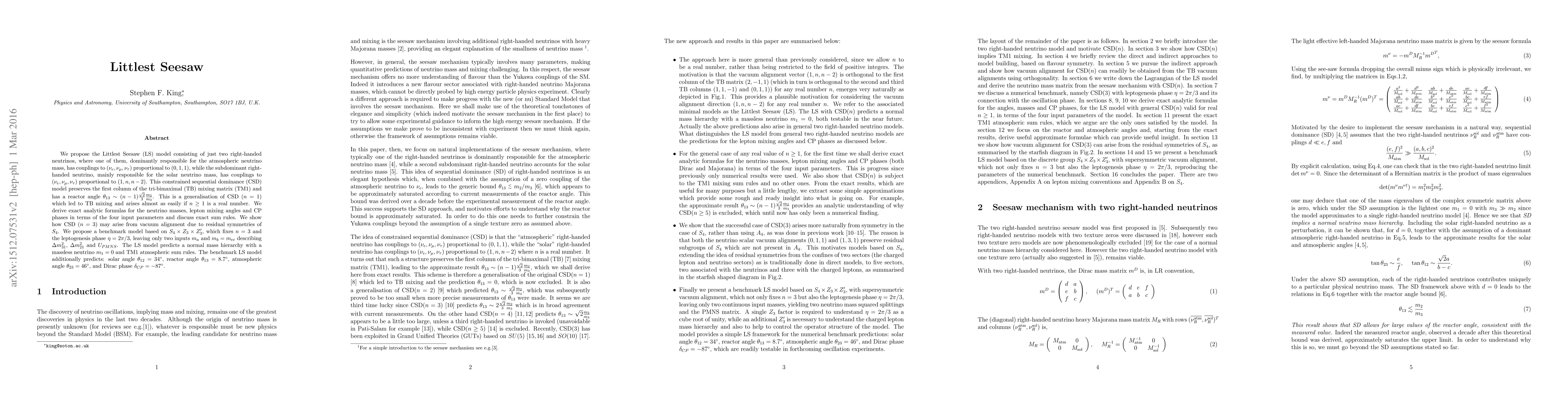 The Littlest Seesaw model proposes a minimal extension of the Standard Model with just two right-handed neutrinos, preserving the first column of the tri-bimaximal (TB) mixing matrix (TM1) and deriving exact analytic formulas for neutrino masses, lepton mixing angles, and CP phases in terms of four input parameters.