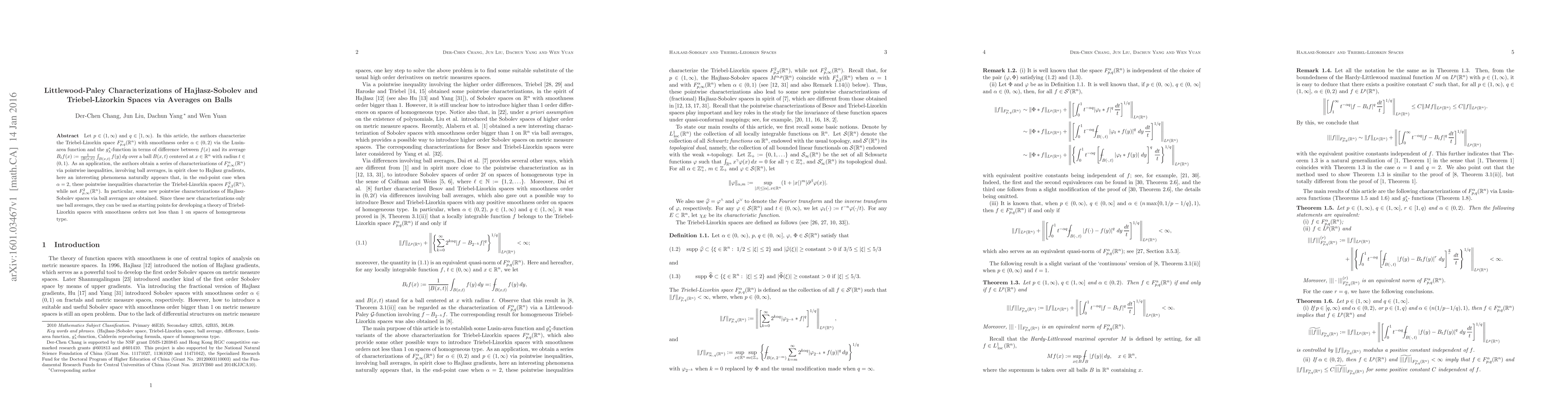 Let $p\in(1,\infty)$ and $q\in[1,\infty)$. In this article, the authors characterize the Triebel-Lizorkin space ${F}^\alpha_{p,q}(\mathbb{R}^n)$ with smoothness order $\alpha\in(0,2)$ via the Lusin-area function and the $g_\lambda^*$-function in terms of difference between $f(x)$ and its average $B_tf(x):=\frac1{|B(x,t)|}\int_{B(x,t)}f(y)\,dy$ over a ball $B(x,t)$ centered at $x\in\mathbb{R}^n$ with radius $t\in(0,1)$. As an application, the authors obtain a series of characterizations of $F^\alpha_{p,\infty}(\mathbb{R}^n)$ via pointwise inequalities, involving ball averages, in spirit close to Haj{\l}asz gradients, here an interesting phenomena naturally appears that, in the end-point case when $\alpha =2$, these pointwise inequalities characterize the Triebel-Lizorkin spaces $F^2_{p,2}(\mathbb{R}^n)$, while not $F^2_{p,\infty}(\mathbb{R}^n)$. In particular, some new pointwise characterizations of Haj{\l}asz-Sobolev spaces via ball averages are obtained. Since these new characterizations only use ball averages, they can be used as starting points for developing a theory of Triebel-Lizorkin spaces with smoothness orders not less than $1$ on spaces of homogeneous type.
