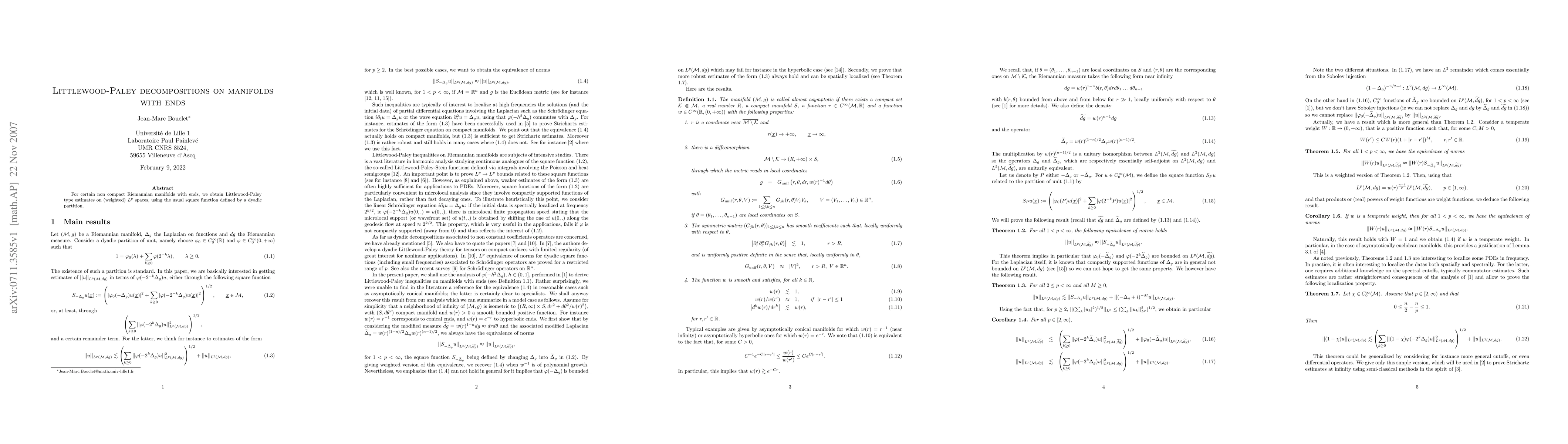 Summary: This paper establishes Littlewood-Paley type estimates on (weighted) Lp spaces for non-compact Riemannian manifolds with ends, utilizing a dyadic square function for the decomposition. These results extend classical techniques to more complex geometric settings.
