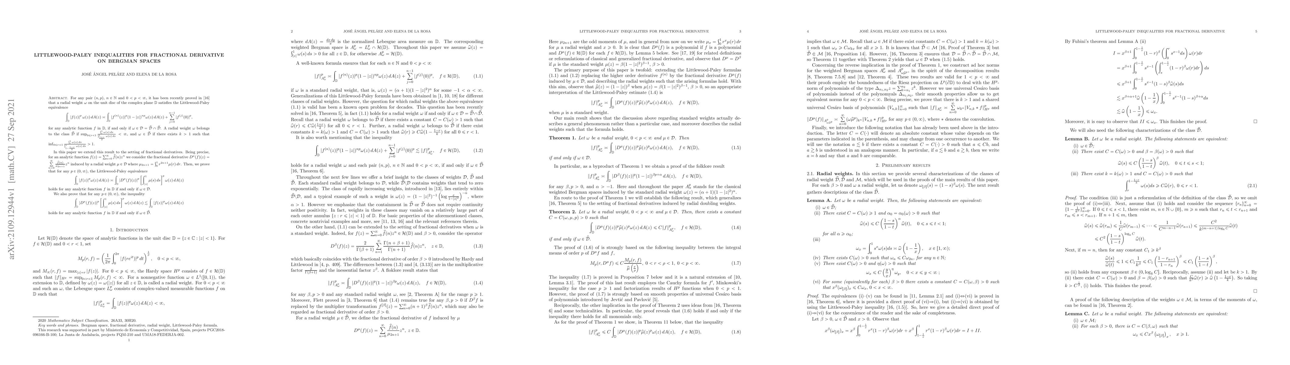 1$ such that $\inf_{0\le r<1} \frac{\int_{r}^1\omega(s)\,ds}{\int_{1-\frac{1-r}{k}}^1 \omega(s)\,ds}>1$. In this paper we extend this result to the setting of fractional derivatives. Being precise, for an analytic function $f(z)=\sum_{n=0}^\infty \widehat{f}(n) z^n$ we consider the fractional derivative $ D^{\mu}(f)(z)=\sum\limits_{n=0}^{\infty} \frac{\widehat{f}(n)}{\mu_{2n+1}} z^n $ induced by a radial weight $\mu \in \mathcal{D}$, where $\mu_{2n+1}=\int_0^1 r^{2n+1}\mu(r)\,dr$. Then, we prove that for any $p\in (0,\infty)$, the Littlewood-Paley equivalence $$\int_{\mathbb{D}} |f(z)|^p \omega(z)\,dA(z)\asymp \int_{\mathbb{D}}|D^{\mu}(f)(z)|^p\left[\int_{|z|}^1\mu(s)\,ds\right]^p\omega(z)\,dA(z)$$ holds for any analytic function $f$ in $\mathbb{D}$ if and only if $\omega\in\mathcal{D}$. We also prove that for any $p\in (0,\infty)$, the inequality $$\int_{\mathbb{D}} |D^{\mu}(f)(z)|^p \left[\int_{|z|}^1\mu(s)\,ds\right]^p\omega(z)\,dA(z) \lesssim \int_{\mathbb{D}} |f(z)|^p \omega(z)\,dA(z) $$ holds for any analytic function $f$ in $\mathbb{D}$ if and only if $\omega\in \widehat{\mathcal{D}}$.