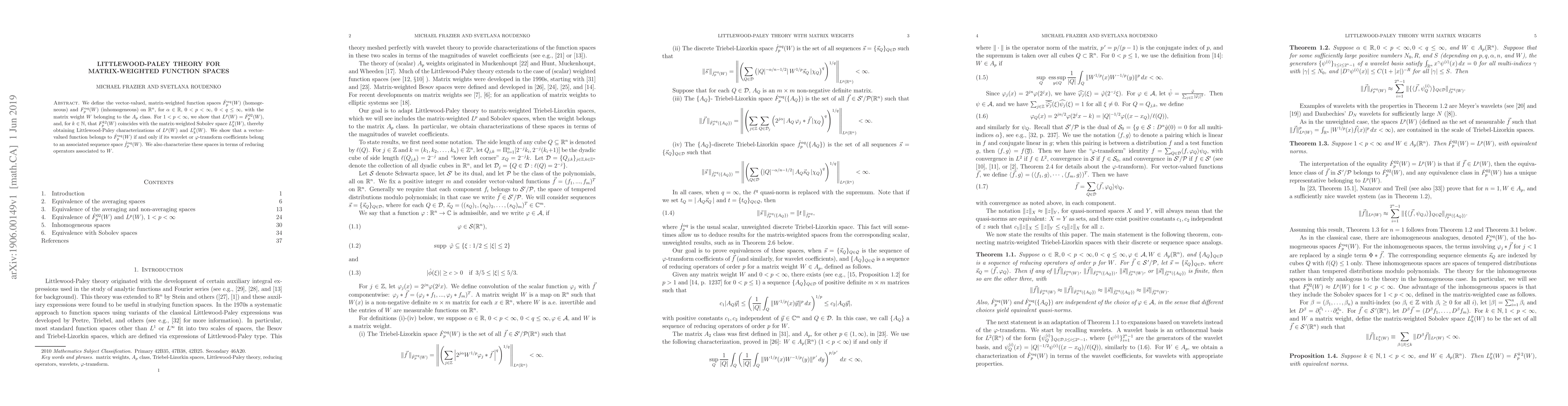 This research paper establishes matrix-weighted function spaces that generalize Littlewood-Paley theory, providing characterizations of $L^p(W)$ and $L^p_k(W)$ in terms of wavelet or $ heta$-transforms and reducing operators.