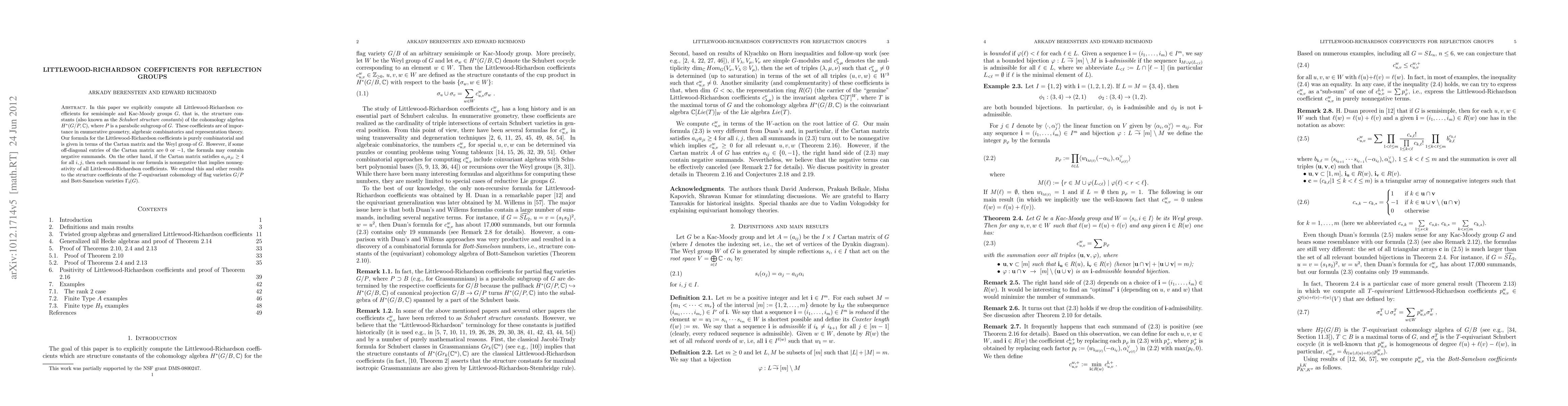 This paper computes Littlewood-Richardson coefficients for semisimple or Kac-Moody groups, relating them to the cohomology algebra of parabolic subgroups. The authors provide a formula dependent on the Cartan matrix and Weyl group, noting that nonnegativity holds under specific conditions on the Cartan matrix.