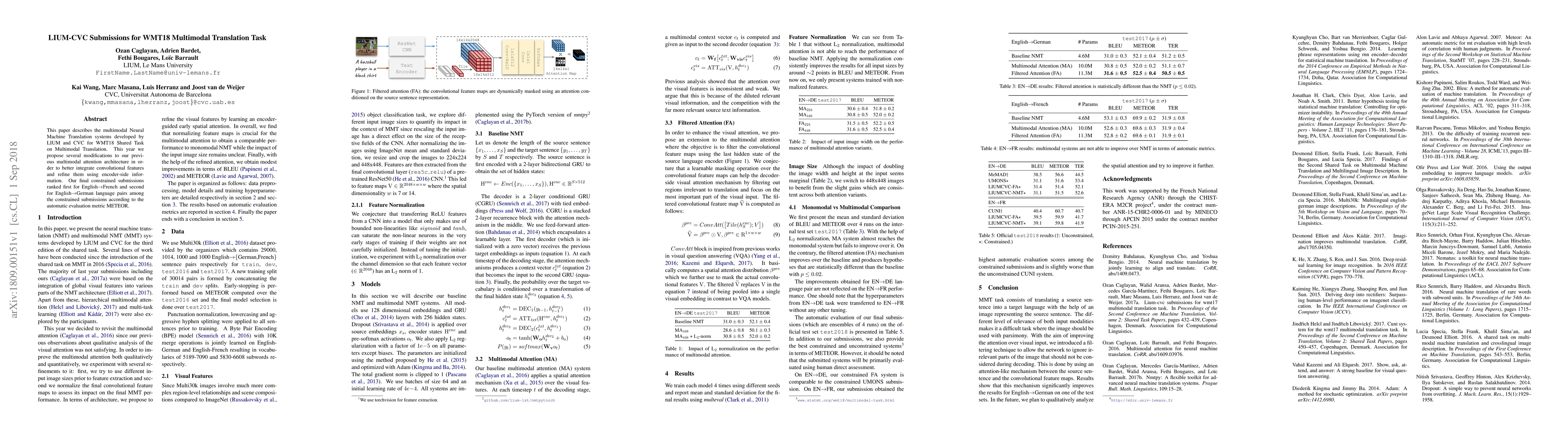 This paper presents LIUM and CVC's multimodal Neural Machine Translation systems for the WMT18 Shared Task, featuring modifications to integrate convolutional features and encoder-side information, achieving first place for English-French and second for English-German in constrained submissions based on the METEOR metric.