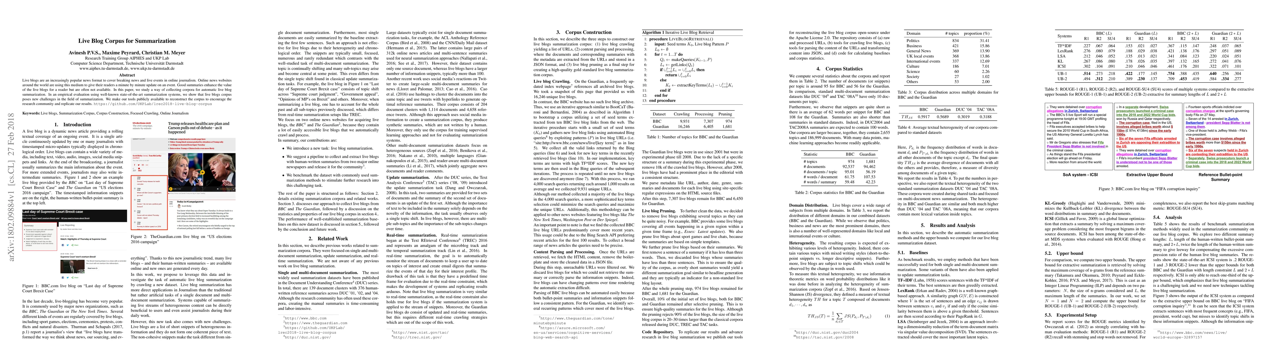 This paper explores the creation of a live blog corpus for automatic summarization, highlighting the unique challenges it presents compared to traditional summarization methods. The authors provide tools to reconstruct the corpus, aiming to spur further research and replication of their findings in the field.