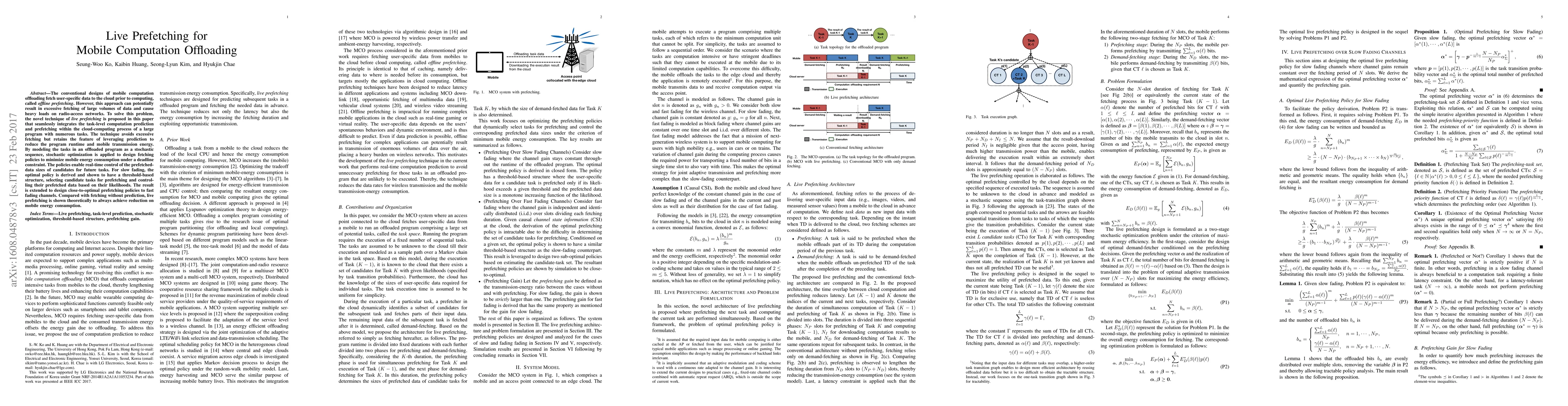 This paper proposes live prefetching to optimize mobile computation offloading by integrating task-level computation prediction with cloud-based prefetching, aiming to reduce excessive data fetching and mobile energy consumption while meeting deadlines. The technique employs stochastic optimization to design adaptive fetching policies for both slow and fast fading channels, demonstrating theoretical reductions in mobile energy usage compared to traditional offline prefetching.