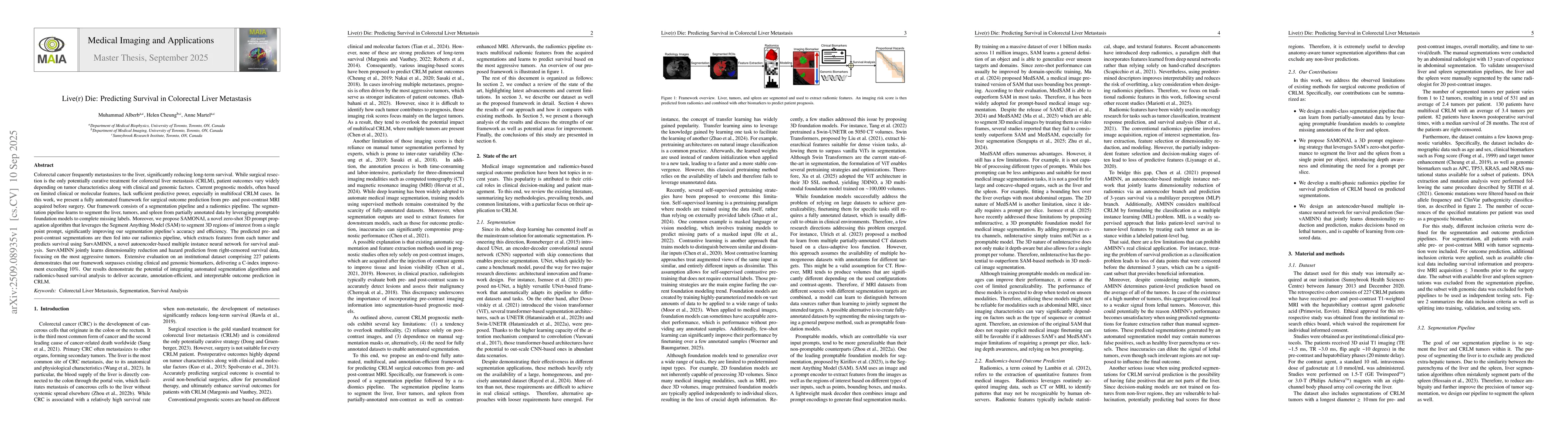 Colorectal cancer frequently metastasizes to the liver, significantly reducing long-term survival. While surgical resection is the only potentially curative treatment for colorectal liver metastasis (CRLM), patient outcomes vary widely depending on tumor characteristics along with clinical and genomic factors. Current prognostic models, often based on limited clinical or molecular features, lack sufficient predictive power, especially in multifocal CRLM cases. We present a fully automated framework for surgical outcome prediction from pre- and post-contrast MRI acquired before surgery. Our framework consists of a segmentation pipeline and a radiomics pipeline. The segmentation pipeline learns to segment the liver, tumors, and spleen from partially annotated data by leveraging promptable foundation models to complete missing labels. Also, we propose SAMONAI, a novel zero-shot 3D prompt propagation algorithm that leverages the Segment Anything Model to segment 3D regions of interest from a single point prompt, significantly improving our segmentation pipeline's accuracy and efficiency. The predicted pre- and post-contrast segmentations are then fed into our radiomics pipeline, which extracts features from each tumor and predicts survival using SurvAMINN, a novel autoencoder-based multiple instance neural network for survival analysis. SurvAMINN jointly learns dimensionality reduction and hazard prediction from right-censored survival data, focusing on the most aggressive tumors. Extensive evaluation on an institutional dataset comprising 227 patients demonstrates that our framework surpasses existing clinical and genomic biomarkers, delivering a C-index improvement exceeding 10%. Our results demonstrate the potential of integrating automated segmentation algorithms and radiomics-based survival analysis to deliver accurate, annotation-efficient, and interpretable outcome prediction in CRLM.