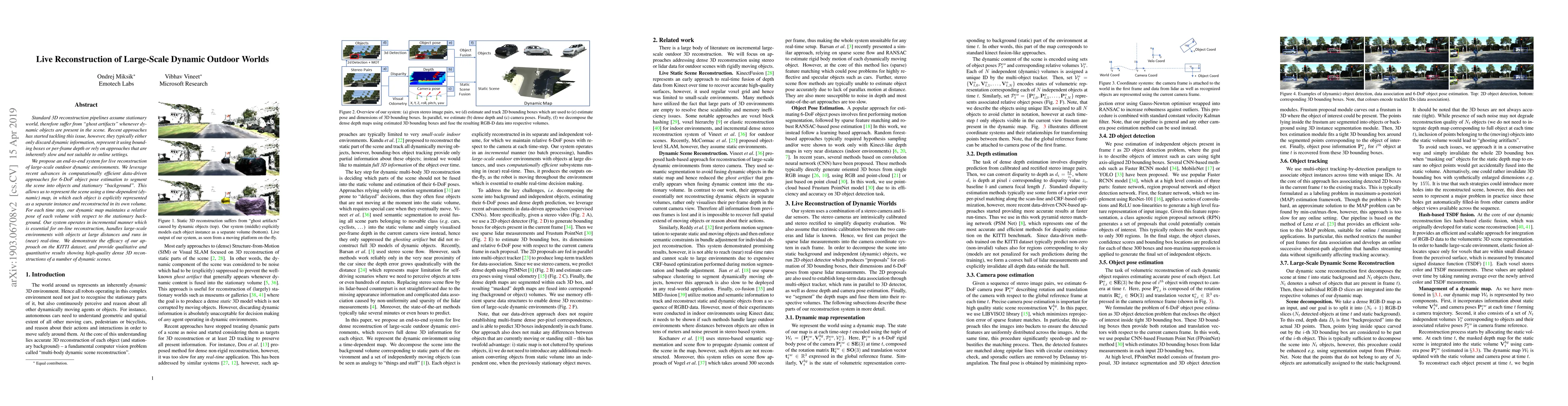 This paper proposes an end-to-end system for live reconstruction of large-scale dynamic outdoor environments, leveraging efficient data-driven 6-DoF object pose estimation to segment scenes into objects and stationary backgrounds. The system maintains a time-dependent dynamic map for near real-time, incremental reconstruction.