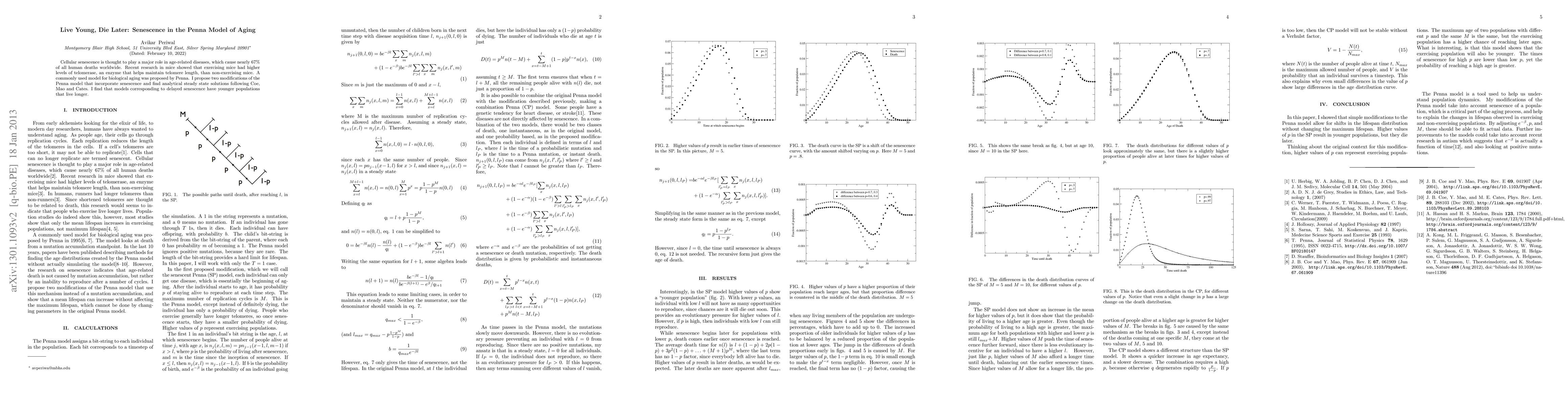 Cellular senescence is thought to play a major role in age-related diseases, which cause nearly 67% of all human deaths worldwide. Recent research in mice showed that exercising mice had higher levels of telomerase, an enzyme that helps maintain telomere length, than non-exercising mice. A commonly used model for biological aging was proposed by Penna. I propose two modifications of the Penna model that incorporate senescence and find analytical steady state solutions following Coe, Mao and Cates. I find that models corresponding to delayed senescence have younger populations that live longer.