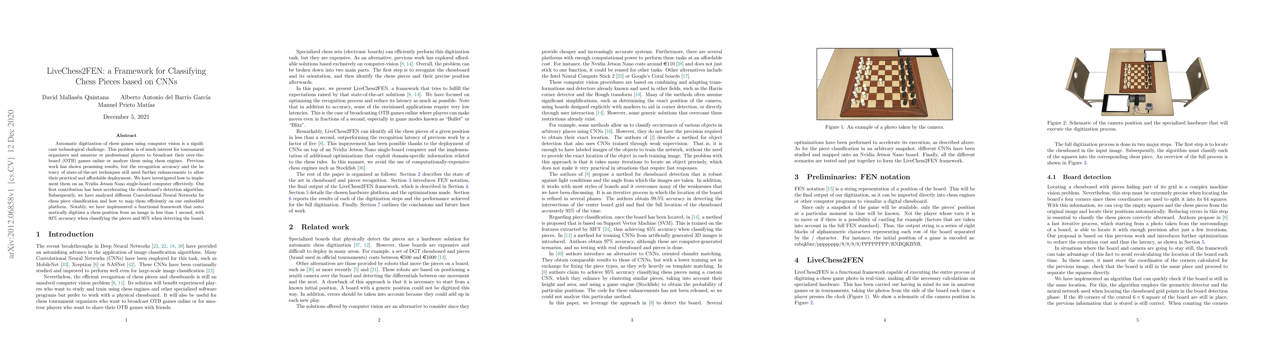 The paper presents LiveChess2FEN, a framework using CNNs to classify chess pieces in images, achieving 92% accuracy in piece classification and 95% in board detection, with less than 1-second latency on an Nvidia Jetson Nano, addressing challenges in automatic digitization of chess games for online broadcasting and analysis.