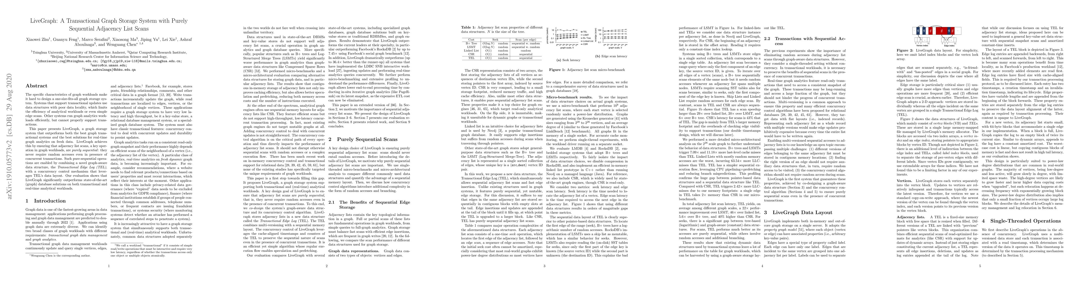 LiveGraph is a transactional graph storage system that excels in both transactional updates and real-time analytics by ensuring purely sequential adjacency list scans, achieved through a Transactional Edge Log and optimized concurrency control, outperforming existing systems.